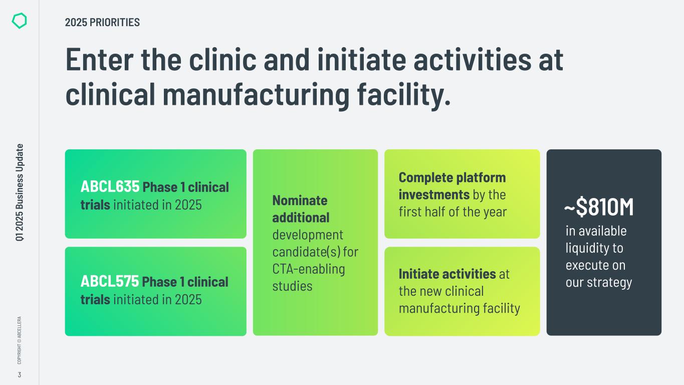 3 CO PY RI GH T © A BC EL LE RA Q1 2 02 5 Bu si ne ss U pd at e Enter the clinic and initiate activities at clinical manufacturing facility. ABCL635 Phase 1 clinical trials initiated in 2025 ABCL575 Phase 1 clinical trials initiated in 2025 Complete platform investments by the first half of the year Initiate activities at the new clinical manufacturing facility Nominate additional development candidate(s) for CTA-enabling studies in available liquidity to execute on our strategy ~$810M 2025 PRIORITIES