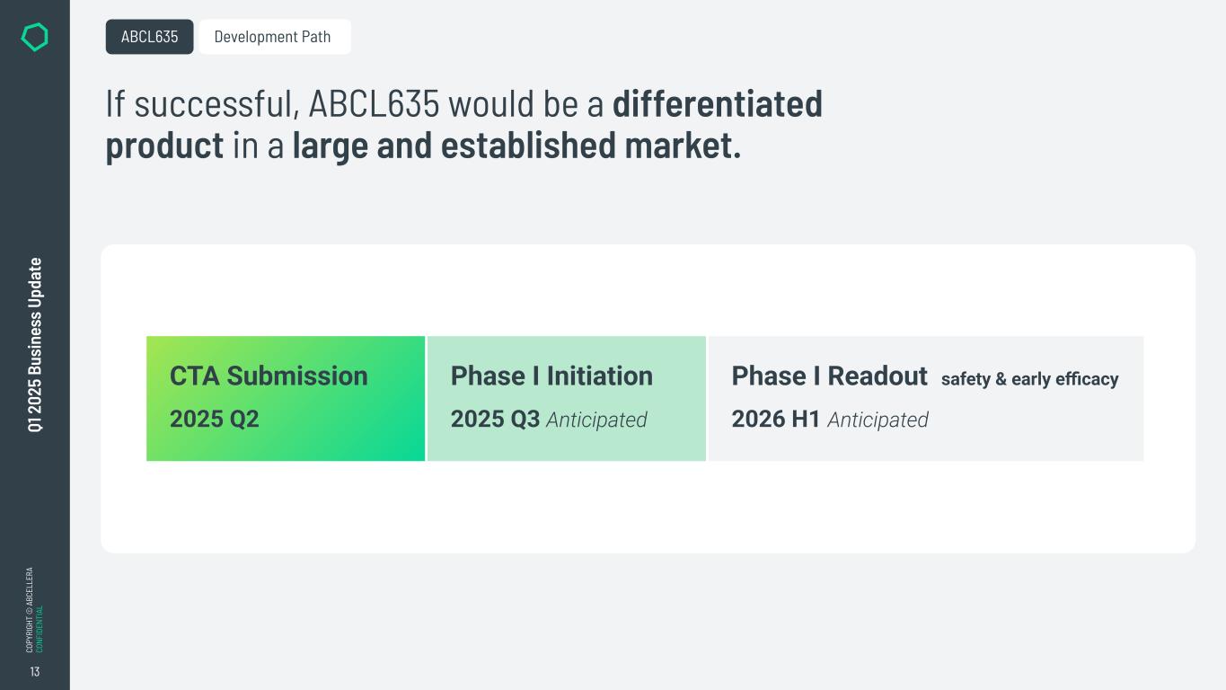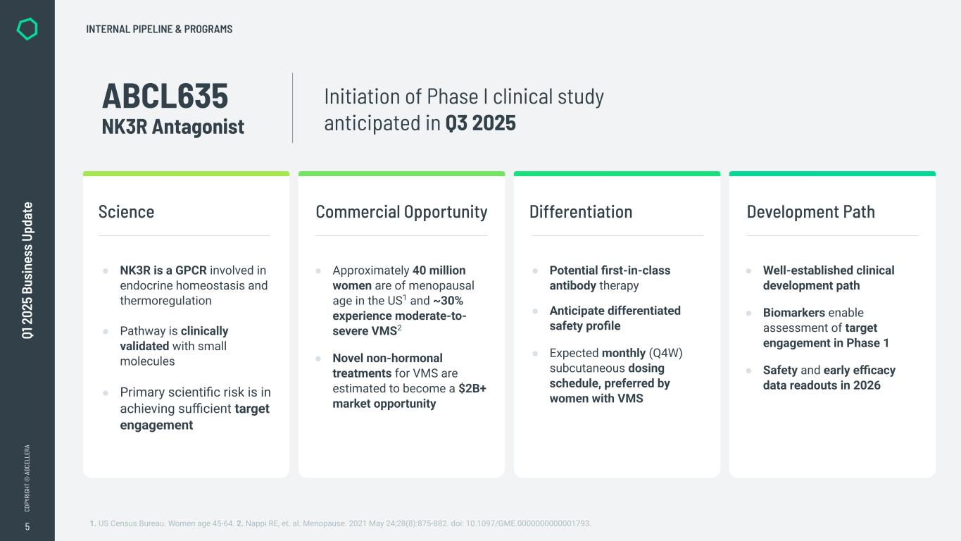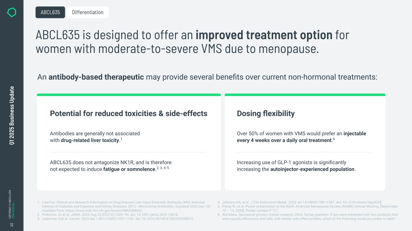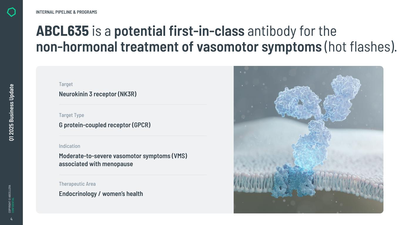 12 CO PY RI GH T © A BC EL LE RA CO NF ID EN TI AL Q1 2 02 5 Bu si ne ss U pd at e ABCL635 is designed to offer an improved treatment option for women with moderate-to-severe VMS due to menopause. 1. LiverTox: Clinical and Research Information on Drug-Induced Liver Injury [Internet]. Bethesda (MD): National Institute of Diabetes and Digestive and Kidney Diseases; 2012-. Monoclonal Antibodies. [Updated 2024 Dec 10]. Available from: https://www.ncbi.nlm.nih.gov/books/NBK548844/. 2. Pinkerton JV, et al. JAMA. 2024 Aug 22;332(16):1343–54. doi: 10.1001/jama.2024.14618. 3. Lederman S,et al. Lancet. 2023 Apr 1;401(10382):1091-1102. doi: 10.1016/S0140-6736(23)00085-5. Potential for reduced toxicities & side-effects An antibody-based therapeutic may provide several benefits over current non-hormonal treatments: ABCL635 Differentiation 4. Johnson KA, et al. J Clin Endocrinol Metab. 2023 Jul 14;108(8):1981-1997. doi: 10.1210/clinem/dgad058. 5. Panay N., et al. Poster presentation at the North American Menopause Society (NAMS) Annual Meeting, [September 10 – 14, 2024]. Poster number P-121. 6. AbCellera. Sponsored primary market research, 2024. Survey question: If you were presented with two products that were equally efficacious and safe, with similar side effect profiles, which of the following would you prefer to take? Antibodies are generally not associated with drug-related liver toxicity.1 ABCL635 does not antagonize NK1R, and is therefore not expected to induce fatigue or somnolence.2, 3, 4, 5 Dosing flexibility Over 50% of women with VMS would prefer an injectable every 4 weeks over a daily oral treatment.6 Increasing use of GLP-1 agonists is significantly increasing the autoinjector-experienced population.