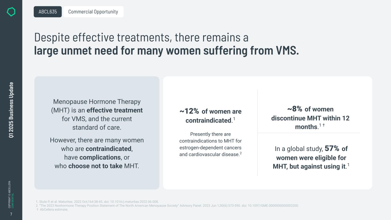 6 CO PY RI GH T © A BC EL LE RA CO NF ID EN TI AL Q1 2 02 5 Bu si ne ss U pd at e VMS are highly prevalent, significantly impact health and well-being, and are the most common reason for seeking treatment for menopause. 1. Avis NE, et al. JAMA Intern Med. 2015 Apr;175(4):531-9. doi: 10.1001/jamainternmed.2014.8063.. 2. Thurston RC, et al. Obstet Gynecol Clin North Am. 2011 Sep;38(3):489-501. doi: 10.1016/j.ogc.2011.05.006. 3. Faubion SS, et al. Mayo Clin Proc. 2023 Jun;98(6):833-845. doi: 10.1016/j.mayocp.2023.02.025. 4. O'Neill MT, et al. Occup Med (Lond). 2023 Sep 29;73(6):332-338. doi: 10.1093/occmed/kqad078. Millions of women seek treatment VMS are a significant burden Commercial Opportunity ABCL635 VMS are the most common symptoms of menopause, persisting for a median of 7.4 years.1 They have a significant impact on quality of life, are associated with cardiovascular disease risk,2 and result in lost productivity, career advancement, and income.3,4,5 Approximately 40 million women are of menopausal age in the US.6 ~30% of women experience moderate-to-severe VMS,7 and it is estimated that more than half seek treatment for menopausal symptoms.8 5. Ko J, et al. Menopause Foundation of Canada; October 16, 2023. Accessed April 24, 2025. https://menopausefoundationcanada.ca/menopause-and-work-in-canada-report/ 6. US Census Bureau. Women age 45-64. 7. Nappi RE, et. al. Menopause. 2021 May 24;28(8):875-882. doi: 10.1097/GME.0000000000001793. 8. Todorova L, et al. Menopause. 2023 Dec 1;30(12):1179-1189. doi: 10.1097/GME.0000000000002265.
