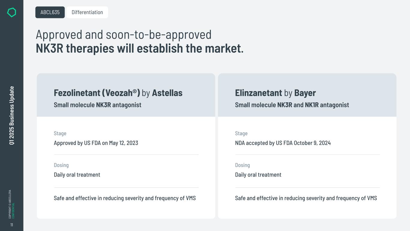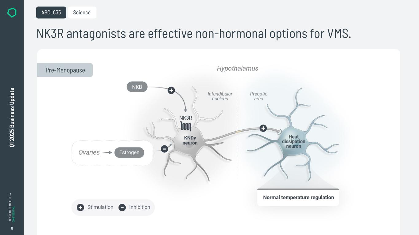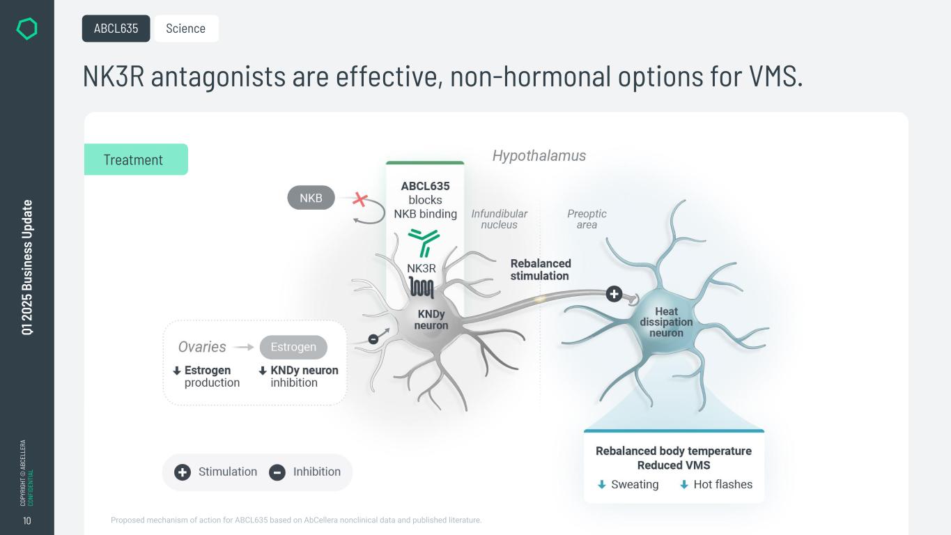 9 CO PY RI GH T © A BC EL LE RA CO NF ID EN TI AL Q1 2 02 5 Bu si ne ss U pd at e NK3R antagonists are effective, non-hormonal options for VMS. ABCL635 Menopause Science