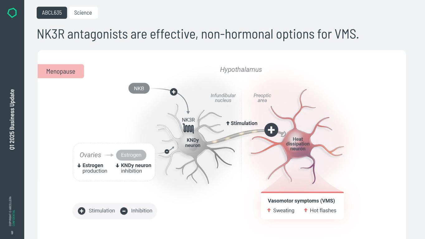 8 CO PY RI GH T © A BC EL LE RA CO NF ID EN TI AL Q1 2 02 5 Bu si ne ss U pd at e NK3R antagonists are effective non-hormonal options for VMS. ABCL635 Science Pre-Menopause
