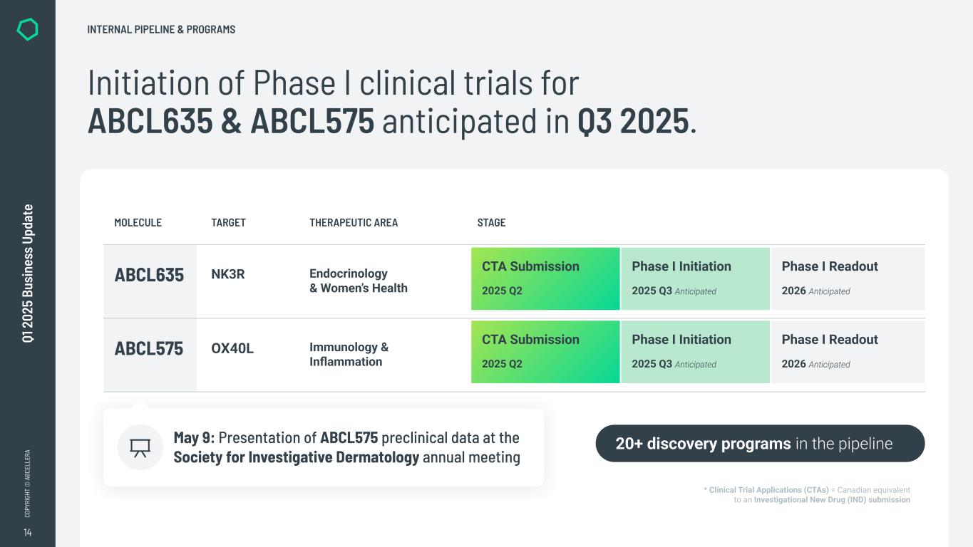 13 CO PY RI GH T © A BC EL LE RA CO NF ID EN TI AL Q1 2 02 5 Bu si ne ss U pd at e If successful, ABCL635 would be a differentiated product in a large and established market. ABCL635 Development Path CTA Submission 2025 Q2 Phase I Initiation 2025 Q3 Anticipated Phase I Readout safety & early efficacy 2026 H1 Anticipated