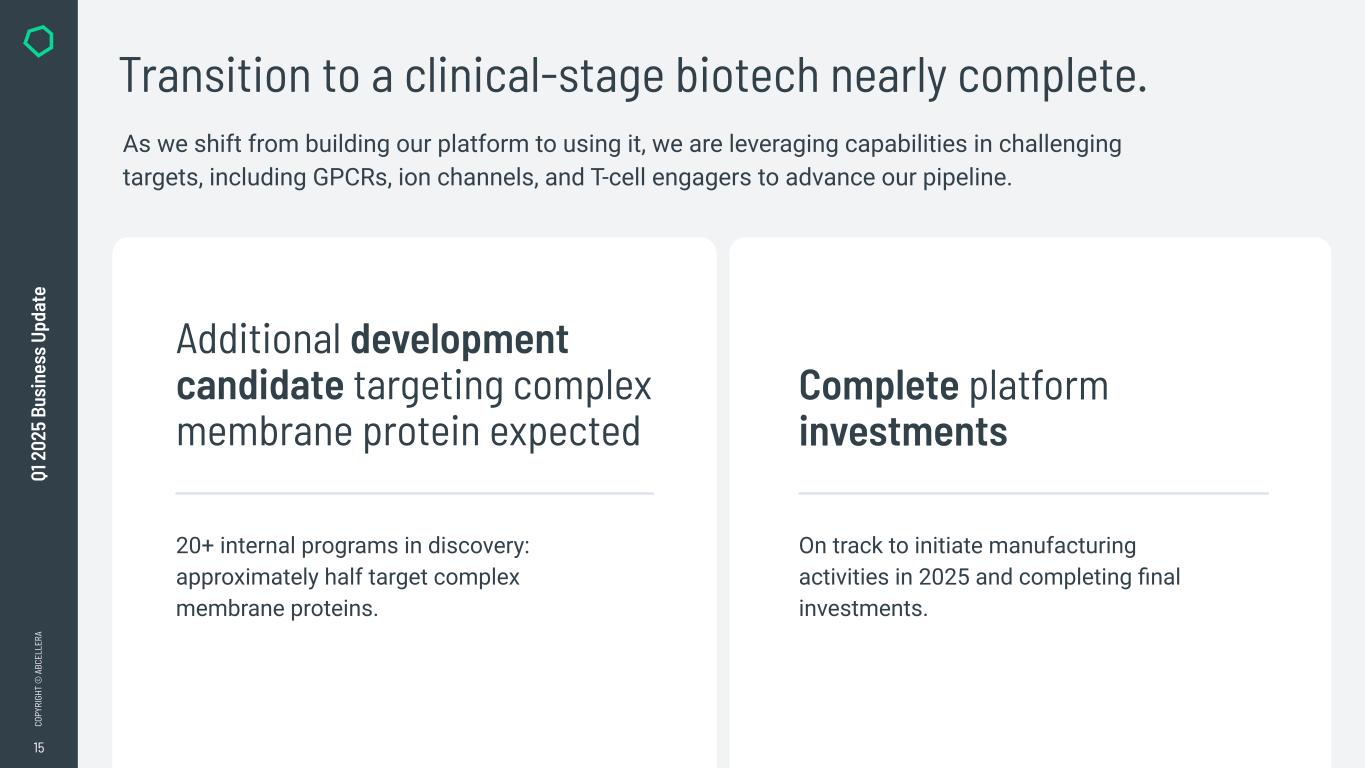 14 CO PY RI GH T © A BC EL LE RA MOLECULE TARGET THERAPEUTIC AREA STAGE ABCL635 NK3R Endocrinology & Women’s Health ABCL575 OX40L Immunology & Inflammation Q1 2 02 5 Bu si ne ss U pd at e Initiation of Phase I clinical trials for ABCL635 & ABCL575 anticipated in Q3 2025. * Clinical Trial Applications (CTAs) = Canadian equivalent to an Investigational New Drug (IND) submission CTA Submission 2025 Q2 Phase I Initiation 2025 Q3 Anticipated Phase I Readout 2026 Anticipated CTA Submission 2025 Q2 Phase I Initiation 2025 Q3 Anticipated Phase I Readout 2026 Anticipated May 9: Presentation of ABCL575 preclinical data at the Society for Investigative Dermatology annual meeting INTERNAL PIPELINE & PROGRAMS 20+ discovery programs in the pipeline