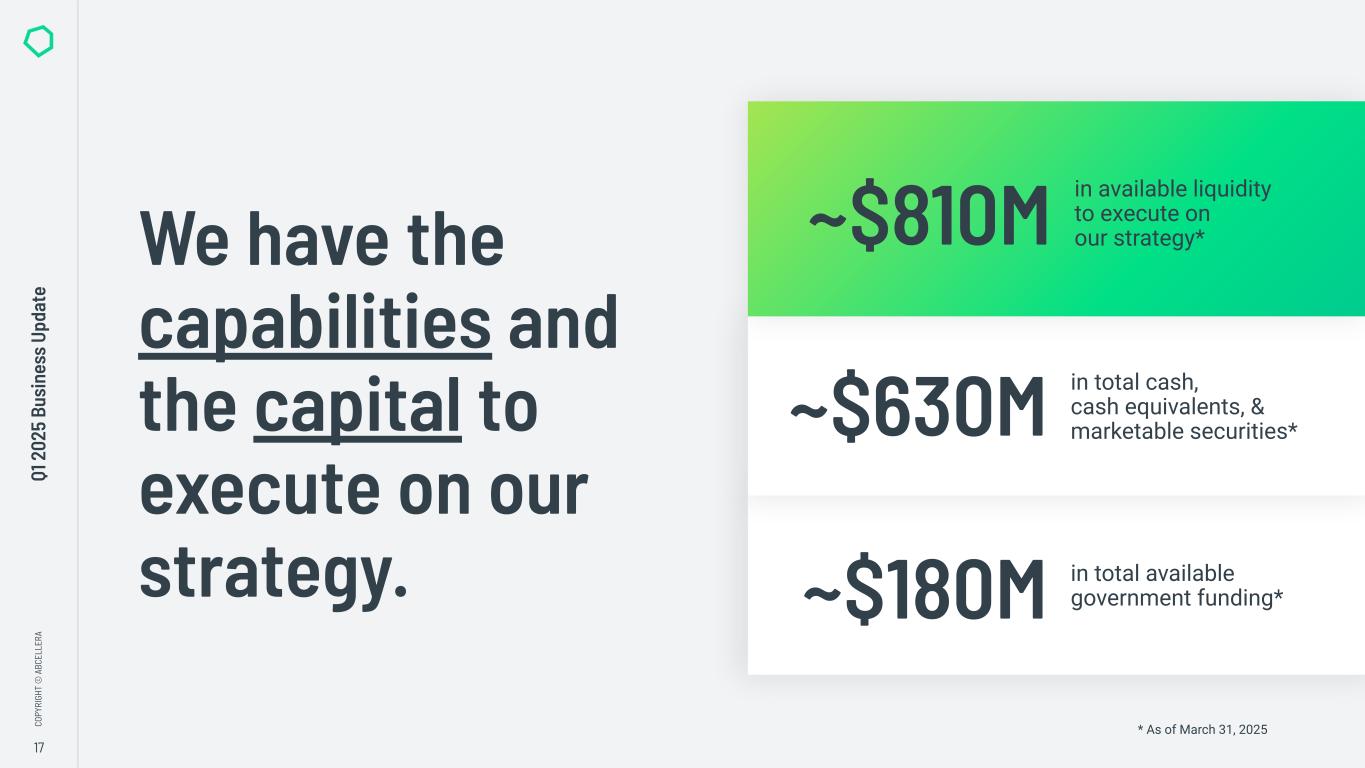 17 CO PY RI GH T © A BC EL LE RA Q1 2 02 5 Bu si ne ss U pd at e We have the capabilities and the capital to execute on our strategy. in total available government funding*~$180M in total cash, cash equivalents, & marketable securities*~$630M in available liquidity to execute on our strategy*~$810M * As of March 31, 2025