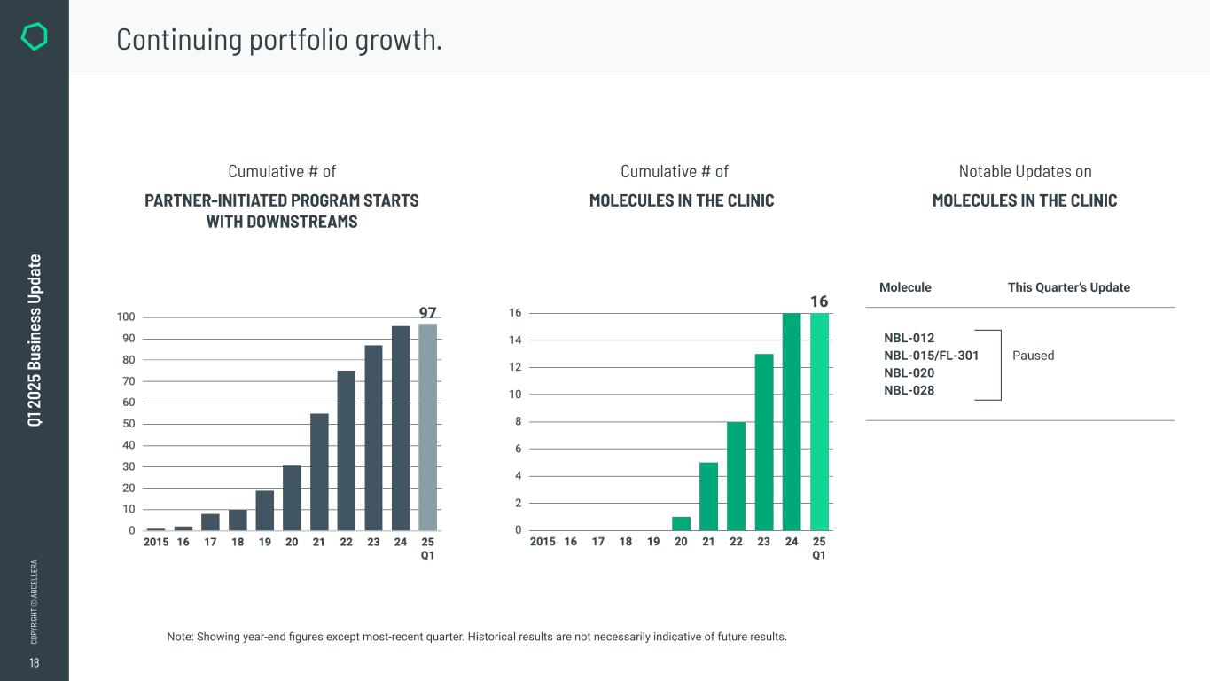 18 CO PY RI GH T © A BC EL LE RA Q1 2 02 5 Bu si ne ss U pd at e PARTNER-INITIATED PROGRAM STARTS WITH DOWNSTREAMS Cumulative # of MOLECULES IN THE CLINIC Cumulative # of Note: Showing year-end figures except most-recent quarter. Historical results are not necessarily indicative of future results. Notable Updates on Molecule This Quarter’s Update NBL-012 NBL-015/FL-301 NBL-020 NBL-028 Paused Continuing portfolio growth. MOLECULES IN THE CLINIC