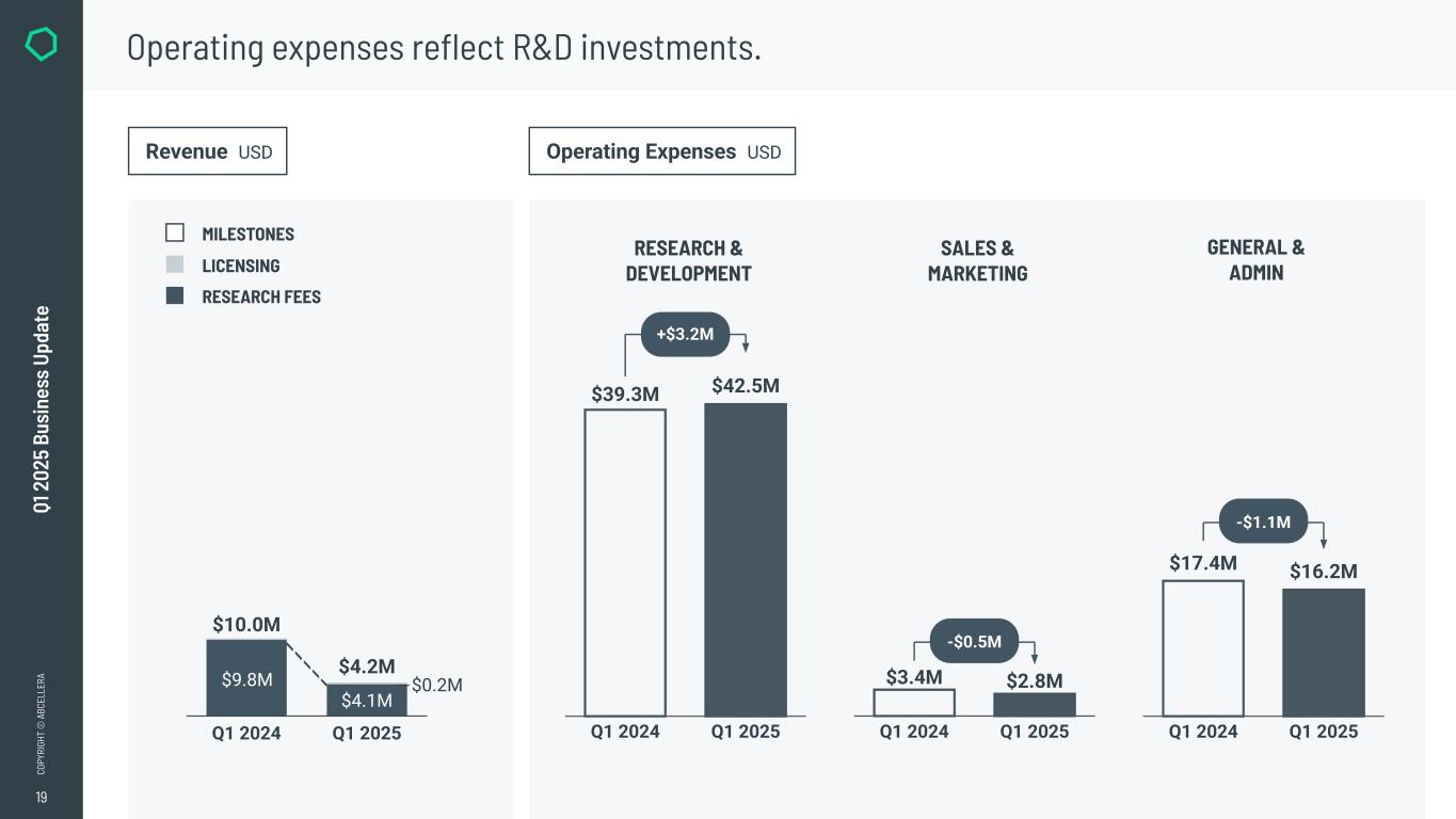 19 CO PY RI GH T © A BC EL LE RA Q1 2 02 5 Bu si ne ss U pd at e Operating expenses reflect R&D investments. Operating Expenses USDRevenue USD Q1 2025Q1 2024 $39.3M $42.5M +$3.2M Q1 2025Q1 2024 $3.4M $2.8M -$0.5M Q1 2025Q1 2024 $17.4M $16.2M -$1.1M RESEARCH & DEVELOPMENT SALES & MARKETING GENERAL & ADMINLICENSING RESEARCH FEES MILESTONES Q1 2025 $0.2M $4.1M $10.0M $4.2M Q1 2024 $9.8M Research fees Licensin g Royalties Milestones