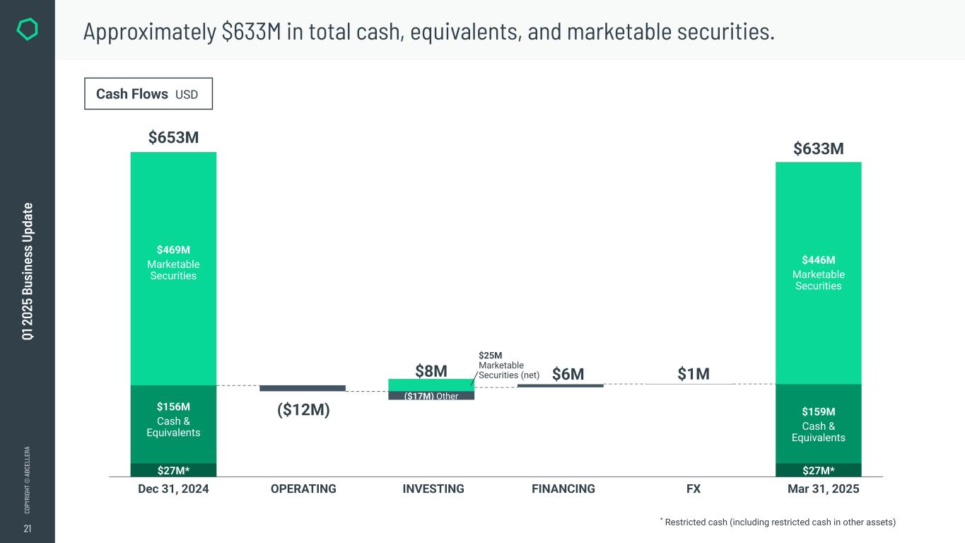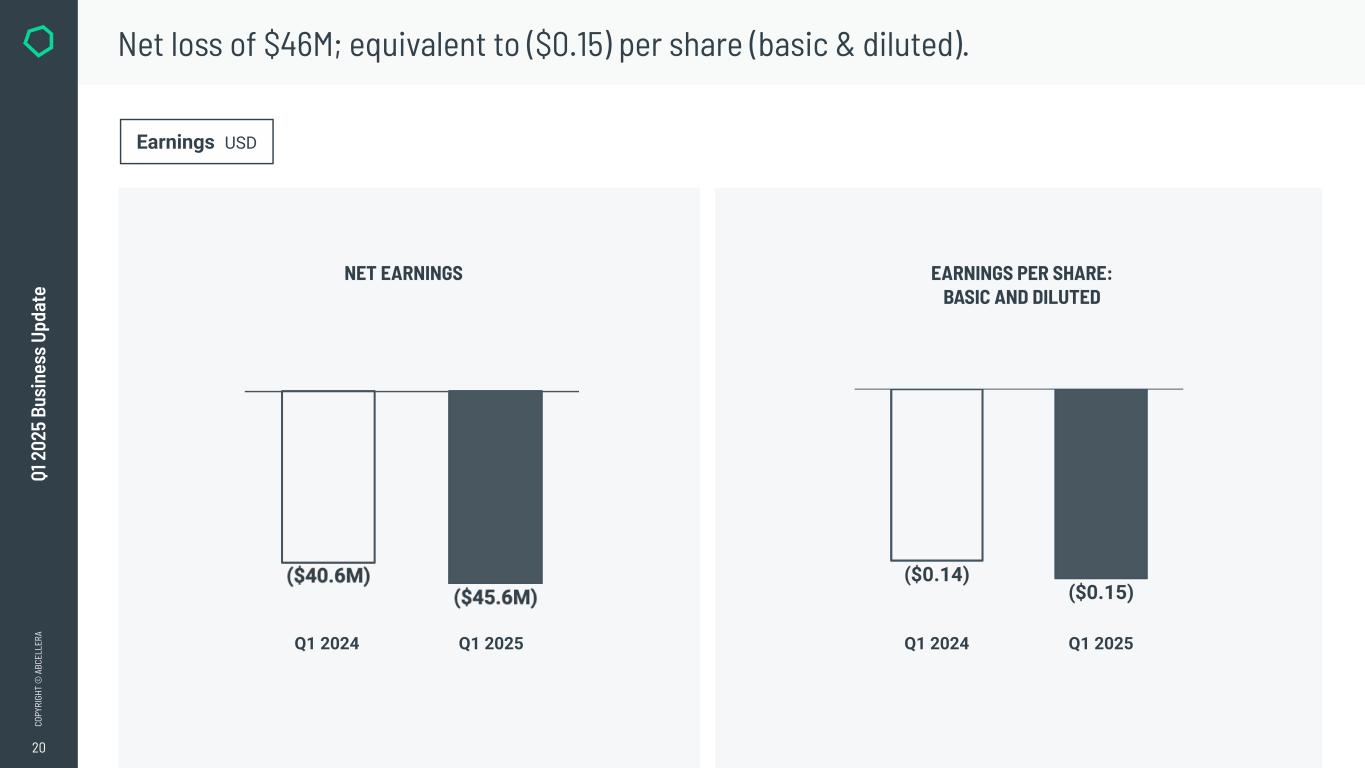 20 CO PY RI GH T © A BC EL LE RA Q1 2 02 5 Bu si ne ss U pd at e Net loss of $46M; equivalent to ($0.15) per share (basic & diluted). Earnings USD NET EARNINGS EARNINGS PER SHARE: BASIC AND DILUTED Q1 2024 Q1 2025 Q1 2024 Q1 2025