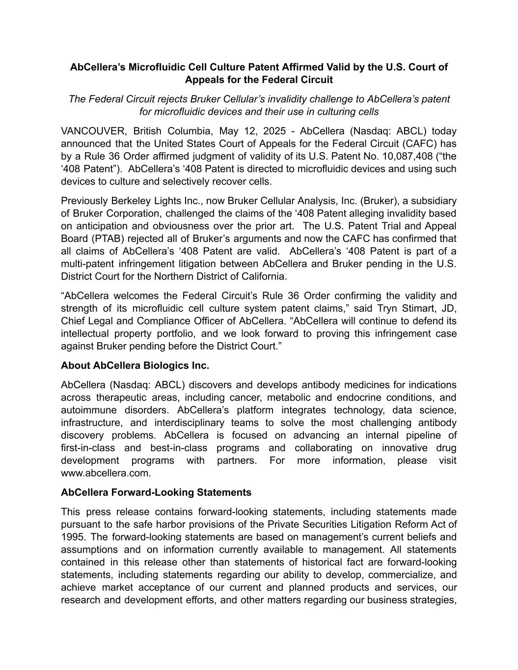AbCellera’s Microfluidic Cell Culture Patent Affirmed Valid by the U.S. Court of Appeals for the Federal Circuit The Federal Circuit rejects Bruker Cellular’s invalidity challenge to AbCellera’s patent for microfluidic devices and their use in culturing cells VANCOUVER, British Columbia, May 12, 2025 - AbCellera (Nasdaq: ABCL) today announced that the United States Court of Appeals for the Federal Circuit (CAFC) has by a Rule 36 Order affirmed judgment of validity of its U.S. Patent No. 10,087,408 (“the ‘408 Patent”). AbCellera’s ‘408 Patent is directed to microfluidic devices and using such devices to culture and selectively recover cells. Previously Berkeley Lights Inc., now Bruker Cellular Analysis, Inc. (Bruker), a subsidiary of Bruker Corporation, challenged the claims of the ‘408 Patent alleging invalidity based on anticipation and obviousness over the prior art. The U.S. Patent Trial and Appeal Board (PTAB) rejected all of Bruker’s arguments and now the CAFC has confirmed that all claims of AbCellera’s ‘408 Patent are valid. AbCellera’s ‘408 Patent is part of a multi-patent infringement litigation between AbCellera and Bruker pending in the U.S. District Court for the Northern District of California. “AbCellera welcomes the Federal Circuit’s Rule 36 Order confirming the validity and strength of its microfluidic cell culture system patent claims,” said Tryn Stimart, JD, Chief Legal and Compliance Officer of AbCellera. “AbCellera will continue to defend its intellectual property portfolio, and we look forward to proving this infringement case against Bruker pending before the District Court.” About AbCellera Biologics Inc. AbCellera (Nasdaq: ABCL) discovers and develops antibody medicines for indications across therapeutic areas, including cancer, metabolic and endocrine conditions, and autoimmune disorders. AbCellera’s platform integrates technology, data science, infrastructure, and interdisciplinary teams to solve the most challenging antibody discovery problems. AbCellera is focused on advancing an internal pipeline of first-in-class and best-in-class programs and collaborating on innovative drug development programs with partners. For more information, please visit www.abcellera.com. AbCellera Forward-Looking Statements This press release contains forward-looking statements, including statements made pursuant to the safe harbor provisions of the Private Securities Litigation Reform Act of 1995. The forward-looking statements are based on management’s current beliefs and assumptions and on information currently available to management. All statements contained in this release other than statements of historical fact are forward-looking statements, including statements regarding our ability to develop, commercialize, and achieve market acceptance of our current and planned products and services, our research and development efforts, and other matters regarding our business strategies,