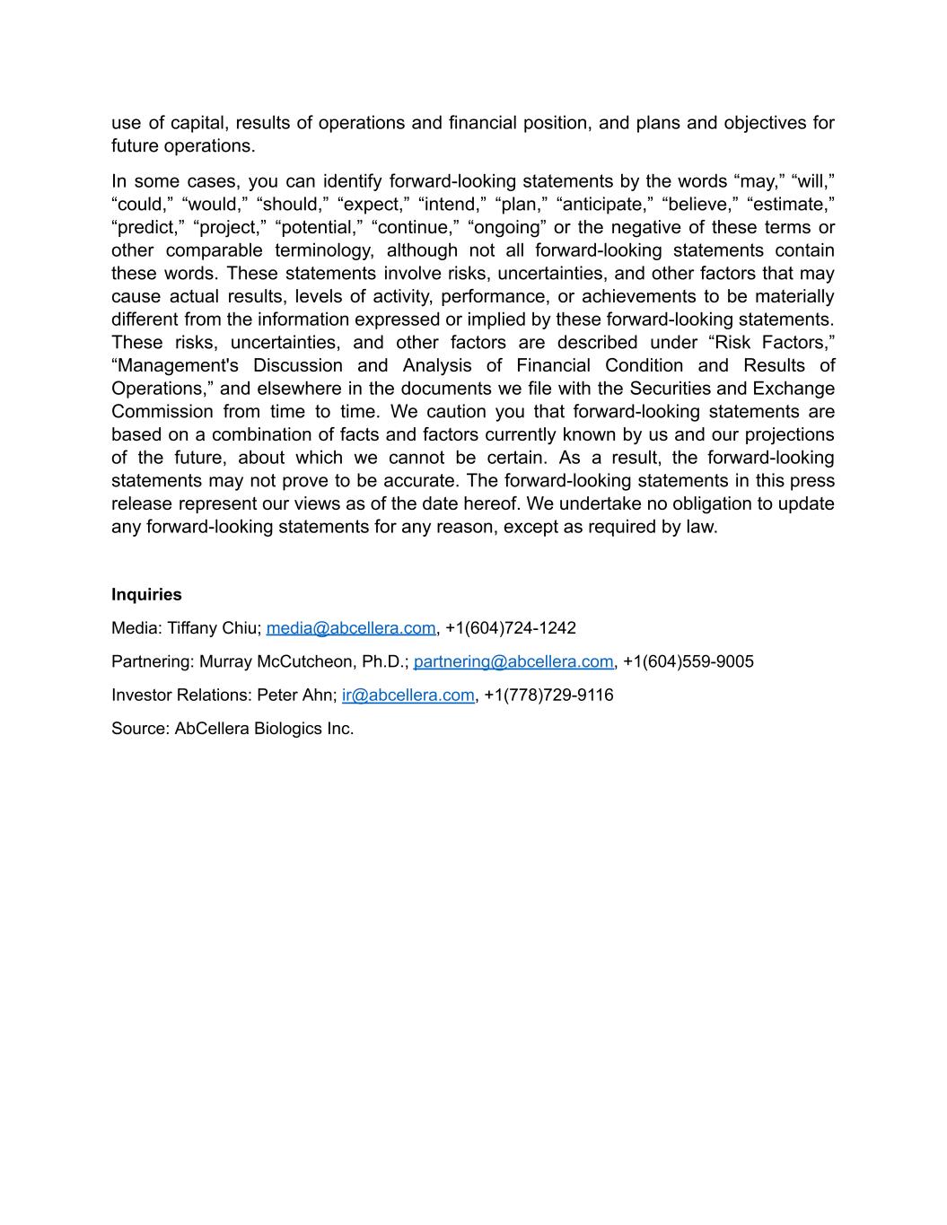 use of capital, results of operations and financial position, and plans and objectives for future operations. In some cases, you can identify forward-looking statements by the words “may,” “will,” “could,” “would,” “should,” “expect,” “intend,” “plan,” “anticipate,” “believe,” “estimate,” “predict,” “project,” “potential,” “continue,” “ongoing” or the negative of these terms or other comparable terminology, although not all forward-looking statements contain these words. These statements involve risks, uncertainties, and other factors that may cause actual results, levels of activity, performance, or achievements to be materially different from the information expressed or implied by these forward-looking statements. These risks, uncertainties, and other factors are described under “Risk Factors,” “Management's Discussion and Analysis of Financial Condition and Results of Operations,” and elsewhere in the documents we file with the Securities and Exchange Commission from time to time. We caution you that forward-looking statements are based on a combination of facts and factors currently known by us and our projections of the future, about which we cannot be certain. As a result, the forward-looking statements may not prove to be accurate. The forward-looking statements in this press release represent our views as of the date hereof. We undertake no obligation to update any forward-looking statements for any reason, except as required by law. Inquiries Media: Tiffany Chiu; media@abcellera.com, +1(604)724-1242 Partnering: Murray McCutcheon, Ph.D.; partnering@abcellera.com, +1(604)559-9005 Investor Relations: Peter Ahn; ir@abcellera.com, +1(778)729-9116 Source: AbCellera Biologics Inc.