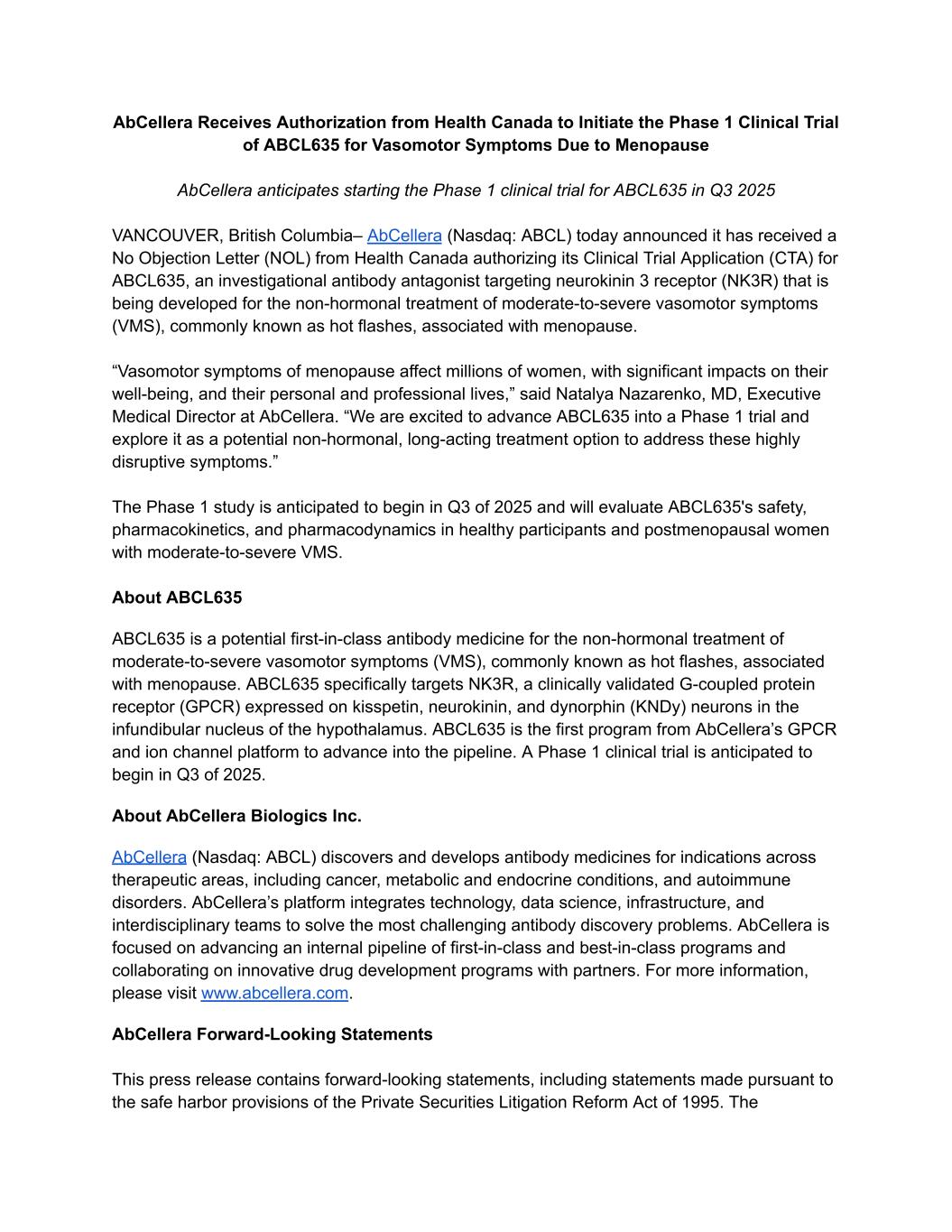 AbCellera Receives Authorization from Health Canada to Initiate the Phase 1 Clinical Trial of ABCL635 for Vasomotor Symptoms Due to Menopause AbCellera anticipates starting the Phase 1 clinical trial for ABCL635 in Q3 2025 VANCOUVER, British Columbia– AbCellera (Nasdaq: ABCL) today announced it has received a No Objection Letter (NOL) from Health Canada authorizing its Clinical Trial Application (CTA) for ABCL635, an investigational antibody antagonist targeting neurokinin 3 receptor (NK3R) that is being developed for the non-hormonal treatment of moderate-to-severe vasomotor symptoms (VMS), commonly known as hot flashes, associated with menopause. “Vasomotor symptoms of menopause affect millions of women, with significant impacts on their well-being, and their personal and professional lives,” said Natalya Nazarenko, MD, Executive Medical Director at AbCellera. “We are excited to advance ABCL635 into a Phase 1 trial and explore it as a potential non-hormonal, long-acting treatment option to address these highly disruptive symptoms.” The Phase 1 study is anticipated to begin in Q3 of 2025 and will evaluate ABCL635's safety, pharmacokinetics, and pharmacodynamics in healthy participants and postmenopausal women with moderate-to-severe VMS. About ABCL635 ABCL635 is a potential first-in-class antibody medicine for the non-hormonal treatment of moderate-to-severe vasomotor symptoms (VMS), commonly known as hot flashes, associated with menopause. ABCL635 specifically targets NK3R, a clinically validated G-coupled protein receptor (GPCR) expressed on kisspetin, neurokinin, and dynorphin (KNDy) neurons in the infundibular nucleus of the hypothalamus. ABCL635 is the first program from AbCellera’s GPCR and ion channel platform to advance into the pipeline. A Phase 1 clinical trial is anticipated to begin in Q3 of 2025. About AbCellera Biologics Inc. AbCellera (Nasdaq: ABCL) discovers and develops antibody medicines for indications across therapeutic areas, including cancer, metabolic and endocrine conditions, and autoimmune disorders. AbCellera’s platform integrates technology, data science, infrastructure, and interdisciplinary teams to solve the most challenging antibody discovery problems. AbCellera is focused on advancing an internal pipeline of first-in-class and best-in-class programs and collaborating on innovative drug development programs with partners. For more information, please visit www.abcellera.com. AbCellera Forward-Looking Statements This press release contains forward-looking statements, including statements made pursuant to the safe harbor provisions of the Private Securities Litigation Reform Act of 1995. The