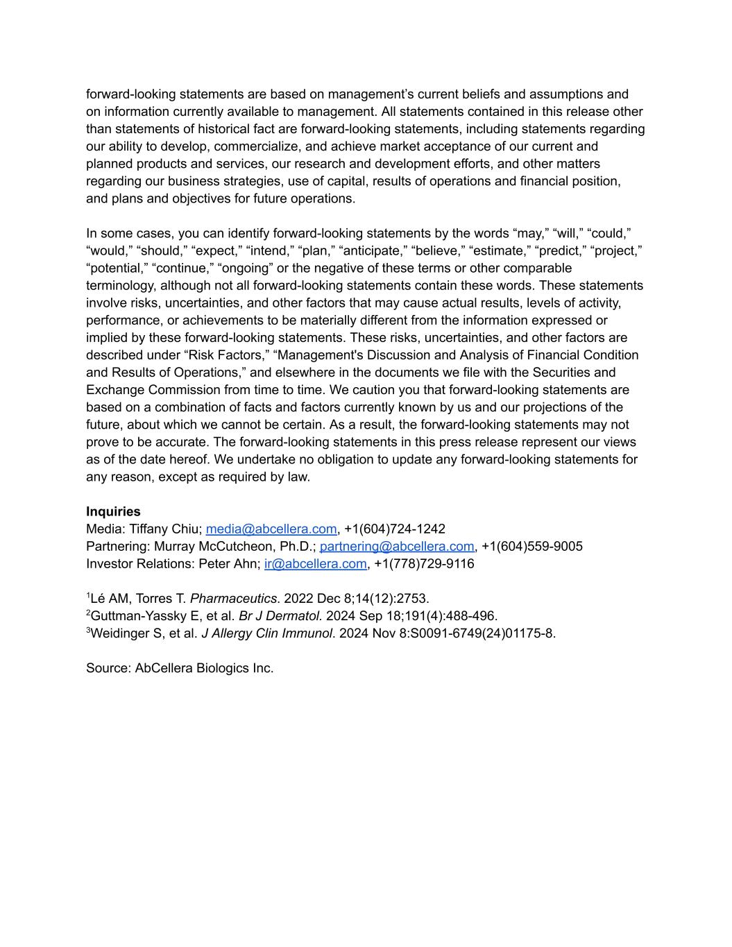 forward-looking statements are based on management’s current beliefs and assumptions and on information currently available to management. All statements contained in this release other than statements of historical fact are forward-looking statements, including statements regarding our ability to develop, commercialize, and achieve market acceptance of our current and planned products and services, our research and development efforts, and other matters regarding our business strategies, use of capital, results of operations and financial position, and plans and objectives for future operations. In some cases, you can identify forward-looking statements by the words “may,” “will,” “could,” “would,” “should,” “expect,” “intend,” “plan,” “anticipate,” “believe,” “estimate,” “predict,” “project,” “potential,” “continue,” “ongoing” or the negative of these terms or other comparable terminology, although not all forward-looking statements contain these words. These statements involve risks, uncertainties, and other factors that may cause actual results, levels of activity, performance, or achievements to be materially different from the information expressed or implied by these forward-looking statements. These risks, uncertainties, and other factors are described under “Risk Factors,” “Management's Discussion and Analysis of Financial Condition and Results of Operations,” and elsewhere in the documents we file with the Securities and Exchange Commission from time to time. We caution you that forward-looking statements are based on a combination of facts and factors currently known by us and our projections of the future, about which we cannot be certain. As a result, the forward-looking statements may not prove to be accurate. The forward-looking statements in this press release represent our views as of the date hereof. We undertake no obligation to update any forward-looking statements for any reason, except as required by law. Inquiries Media: Tiffany Chiu; media@abcellera.com, +1(604)724-1242 Partnering: Murray McCutcheon, Ph.D.; partnering@abcellera.com, +1(604)559-9005 Investor Relations: Peter Ahn; ir@abcellera.com, +1(778)729-9116 1Lé AM, Torres T. Pharmaceutics. 2022 Dec 8;14(12):2753. 2Guttman-Yassky E, et al. Br J Dermatol. 2024 Sep 18;191(4):488-496. 3Weidinger S, et al. J Allergy Clin Immunol. 2024 Nov 8:S0091-6749(24)01175-8. Source: AbCellera Biologics Inc.