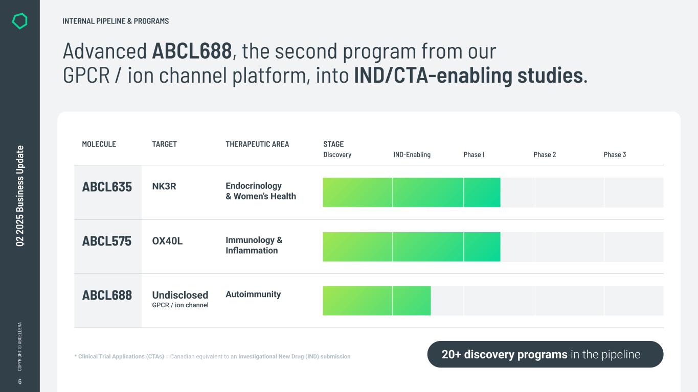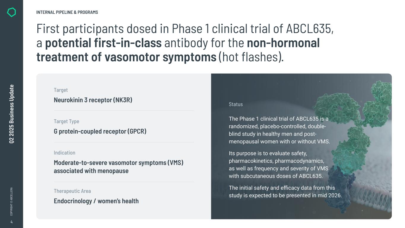 4 CO PY RI GH T © A BC EL LE RA Q2 2 02 5 Bu si ne ss U pd at e Neurokinin 3 receptor (NK3R) First participants dosed in Phase 1 clinical trial of ABCL635, a potential first-in-class antibody for the non-hormonal treatment of vasomotor symptoms (hot flashes). Target G protein-coupled receptor (GPCR) Target Type Moderate-to-severe vasomotor symptoms (VMS) associated with menopause Indication Endocrinology / women’s health Therapeutic Area INTERNAL PIPELINE & PROGRAMS The Phase 1 clinical trial of ABCL635 is a randomized, placebo-controlled, double- blind study in healthy men and post- menopausal women with or without VMS. Its purpose is to evaluate safety, pharmacokinetics, pharmacodynamics, as well as frequency and severity of VMS with subcutaneous doses of ABCL635. The initial safety and efficacy data from this study is expected to be presented in mid 2026. Status