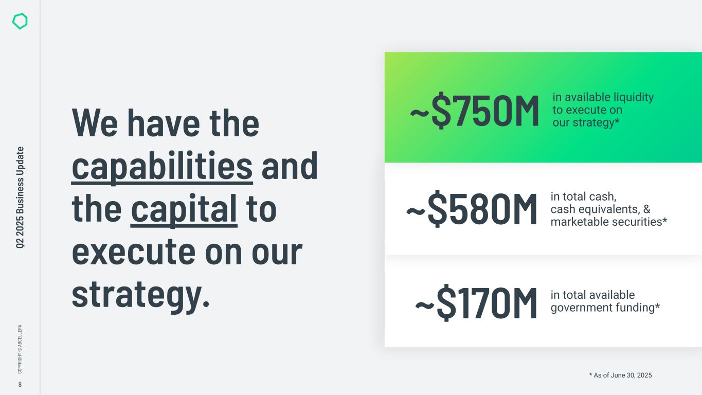 8 CO PY RI GH T © A BC EL LE RA Q2 2 02 5 Bu si ne ss U pd at e We have the capabilities and the capital to execute on our strategy. in total available government funding*~$170M in total cash, cash equivalents, & marketable securities*~$580M in available liquidity to execute on our strategy*~$750M * As of June 30, 2025