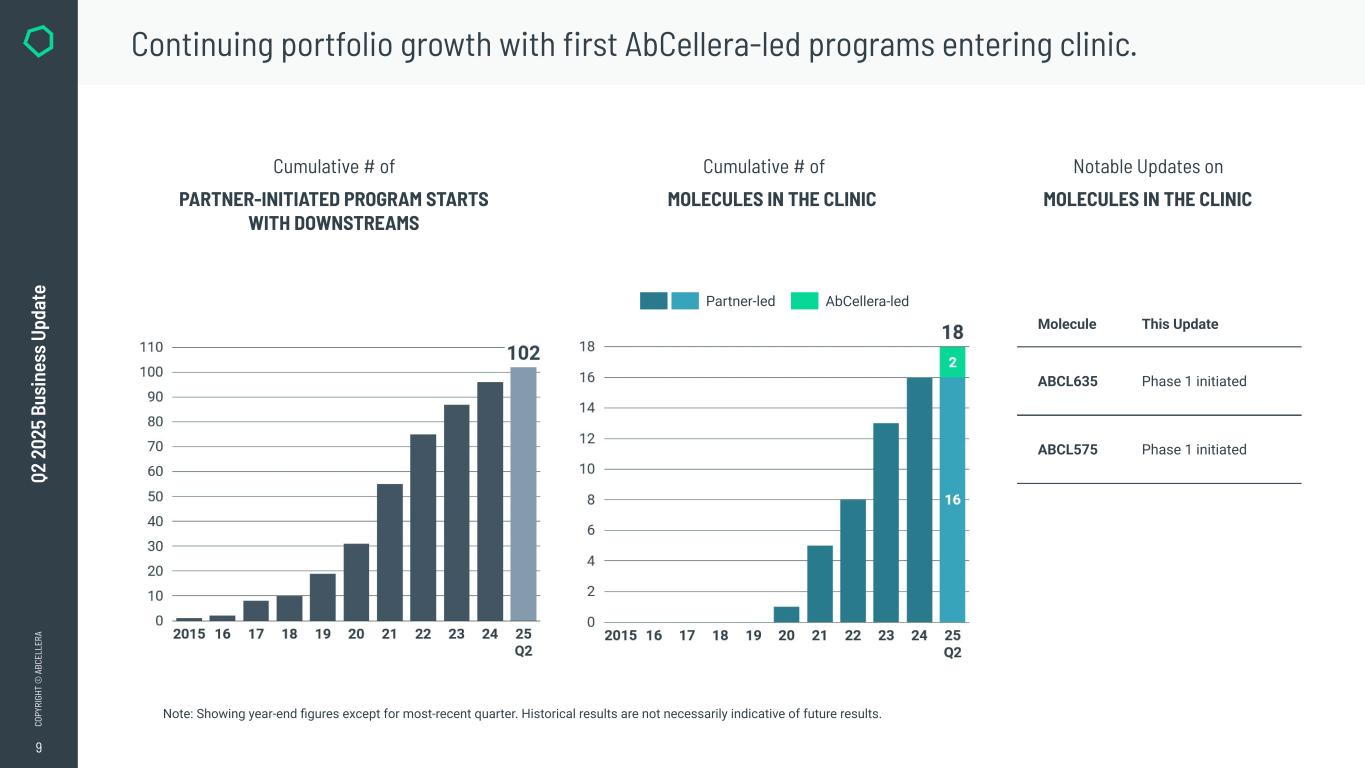 9 CO PY RI GH T © A BC EL LE RA Q2 2 02 5 Bu si ne ss U pd at e PARTNER-INITIATED PROGRAM STARTS WITH DOWNSTREAMS Cumulative # of MOLECULES IN THE CLINIC Cumulative # of Note: Showing year-end figures except for most-recent quarter. Historical results are not necessarily indicative of future results. Notable Updates on Continuing portfolio growth with first AbCellera-led programs entering clinic. MOLECULES IN THE CLINIC AbCellera-led Partner-led Molecule This Update ABCL635 Phase 1 initiated ABCL575 Phase 1 initiated