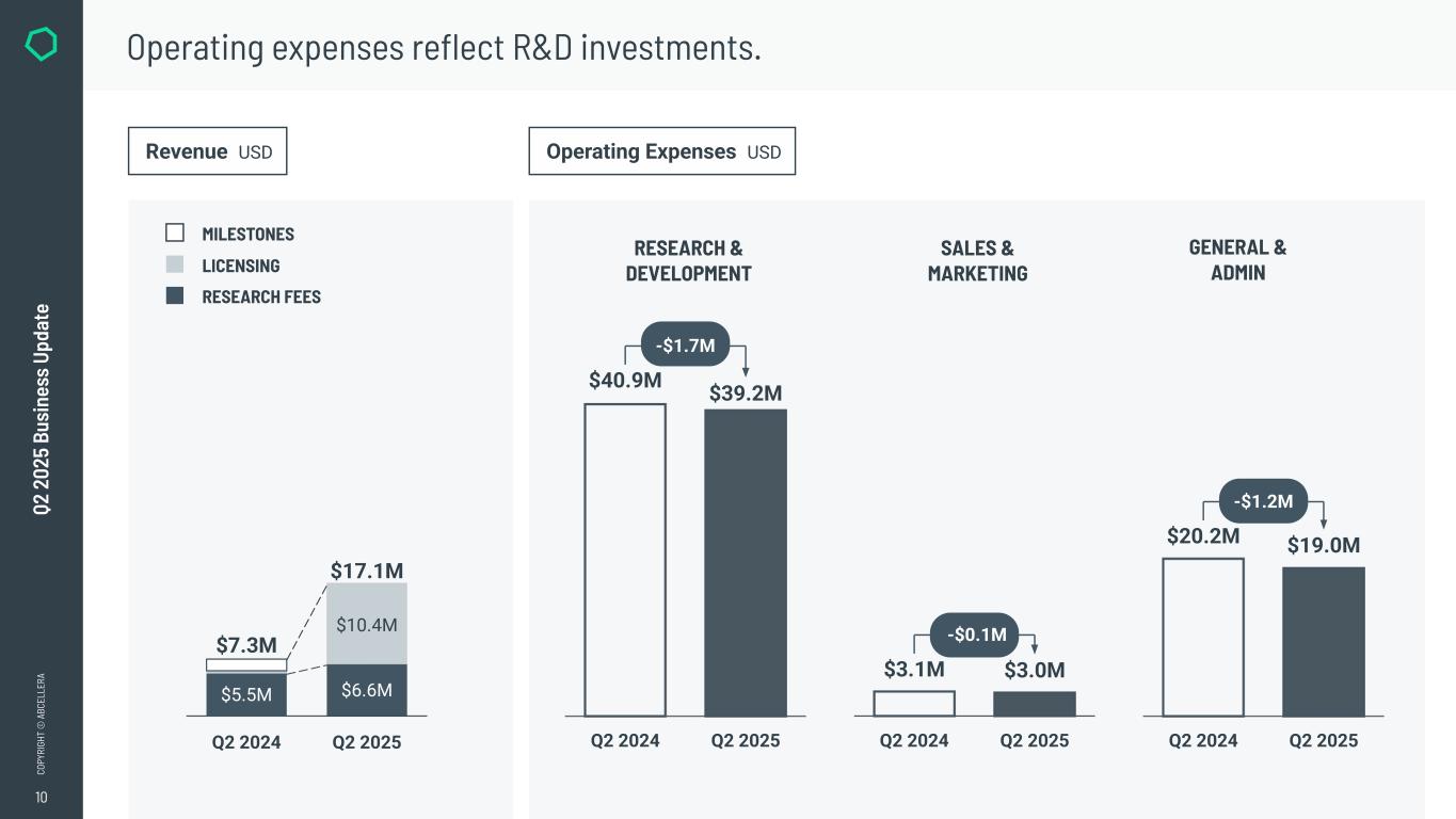 10 CO PY RI GH T © A BC EL LE RA Q2 2 02 5 Bu si ne ss U pd at e Operating expenses reflect R&D investments. Operating Expenses USDRevenue USD Q2 2025Q2 2024 $40.9M $39.2M -$1.7M Q2 2025Q2 2024 $3.1M $3.0M -$0.1M Q2 2025Q2 2024 $20.2M $19.0M -$1.2M RESEARCH & DEVELOPMENT SALES & MARKETING GENERAL & ADMINLICENSING RESEARCH FEES MILESTONES $10.4M Q2 2025 $6.6M Q2 2024 $7.3M $17.1M $5.5M Research fees Licensin g Milestones