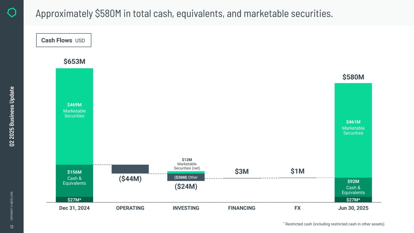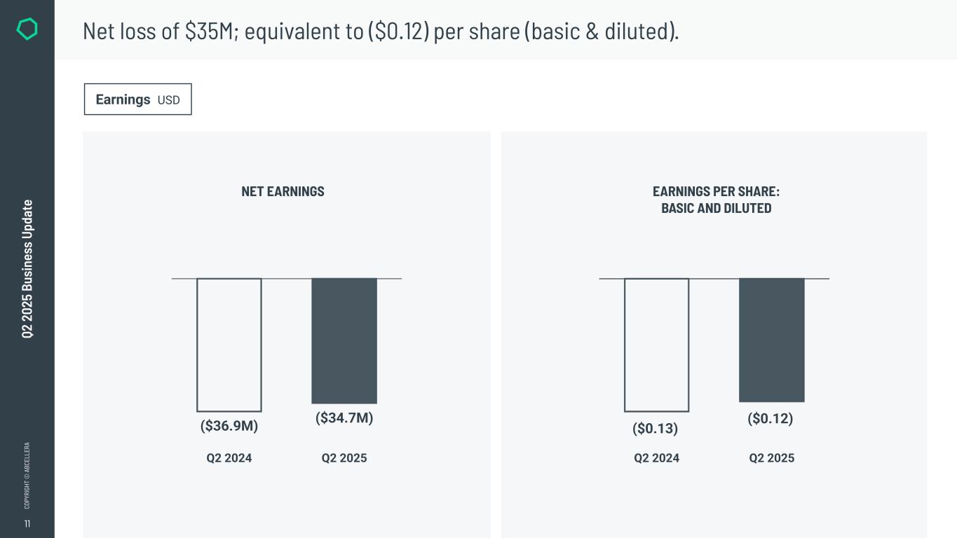 11 CO PY RI GH T © A BC EL LE RA Q2 2 02 5 Bu si ne ss U pd at e Net loss of $35M; equivalent to ($0.12) per share (basic & diluted). Earnings USD NET EARNINGS EARNINGS PER SHARE: BASIC AND DILUTED Q2 2024 Q2 2025 ($36.9M) ($34.7M) Q2 2024 Q2 2025 Post-production ❑ Move “Q” labels down ($0.13) ($0.12)