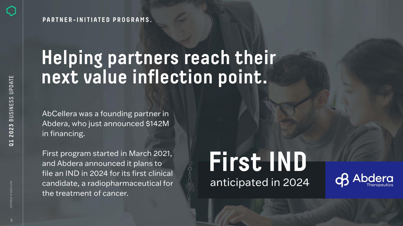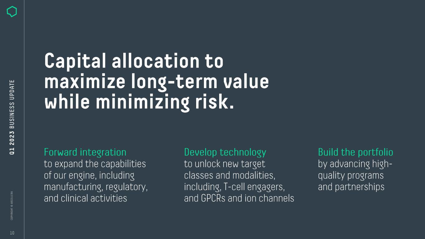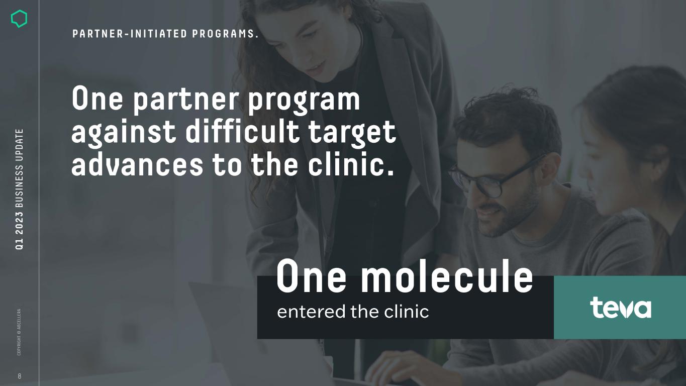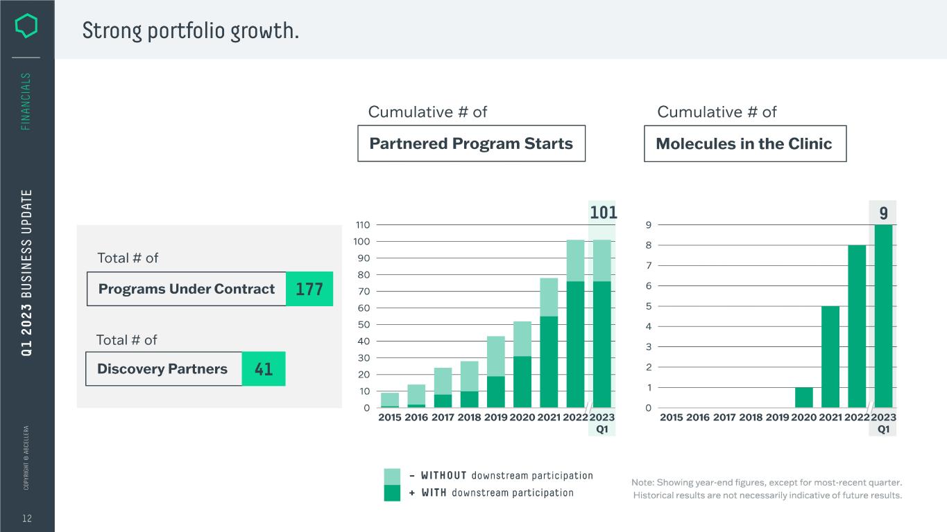 Strong portfolio growth. Total# of Programs Under Contract Total# of Discovery Partners Cumulative# of Partnered Program Starts 101 110 ---------------- 100 ------------------,r--- 90 ----------------1 80 -------------------- 70 --------------1 60 ----------- 50 ----------I 40 -------------1 30 -------------1 20 ---------1? 1 0 ---==----1 0 ----■L....J-L--- 2015 2016 2017 2018 2019 2020 2021 2022 2023 Q1 - WITHOUT downstream participation + WITH downstream participation Cumulative# of Molecules in the Clinic 9--------------- 8 ------------- 7 ------------- 6 ------------- 5 ----------- 4----------- 3----------- 2----------- 9 2015 2016 2017 2018 2019 2020 2021 2022 2023 Q1 Note: Showing year-end figures, except for most-recent quarter. Historical results are not necessarily indicative of future results.
