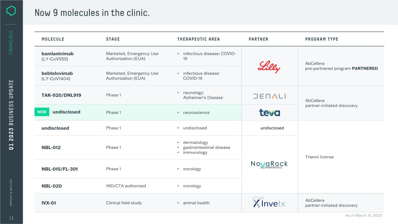 • • • • • • • • • • • Now 9 molecules in the clinic. MOLECULE STAGE THERAPEUTIC AREA PARTNER PROGRAM TYPE bamlanivimab Marketed, Emergency Use infectious disease: COVID- (L Y-CoV555) Authorization (EUA) 19 ~ AbCellera pre-partnered program PARTNERED bebtelovimab Marketed, Emergency Use infectious disease: (L Y-CoV1404) Authorization (EUA) COVID-19 TAK·920/DNL919 Phase 1 neurology: ::J E n 1\L I Alzheimer's Disease AbCellera Ill undisclosed partner-initiated discovery Phase 1 neuroscience te a undisclosed Phase 1 undisclosed undisclosed dermatology NBL-012 Phase 1 gastrointestinal disease immunology Trianni license NBL-015/FL-301 Phase 1 oncology N °Vo9R~E~cY k NBL-020 IND/CTA authorized oncology IVX-01 Clinical field study animal health Xlnvetx AbCellera partner-initiated discovery As of March 31, 2023