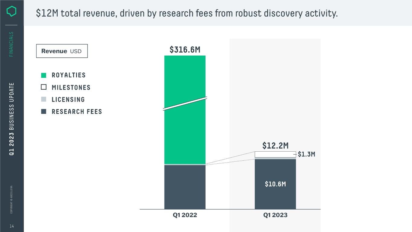 $12M total revenue, driven by research fees from robust discovery activity. I Revenue uso ■ ROYALTIES □ MILESTONES ■ LICENSING ■ RESEARCH FEES $316.6M Q12022 Q12023
