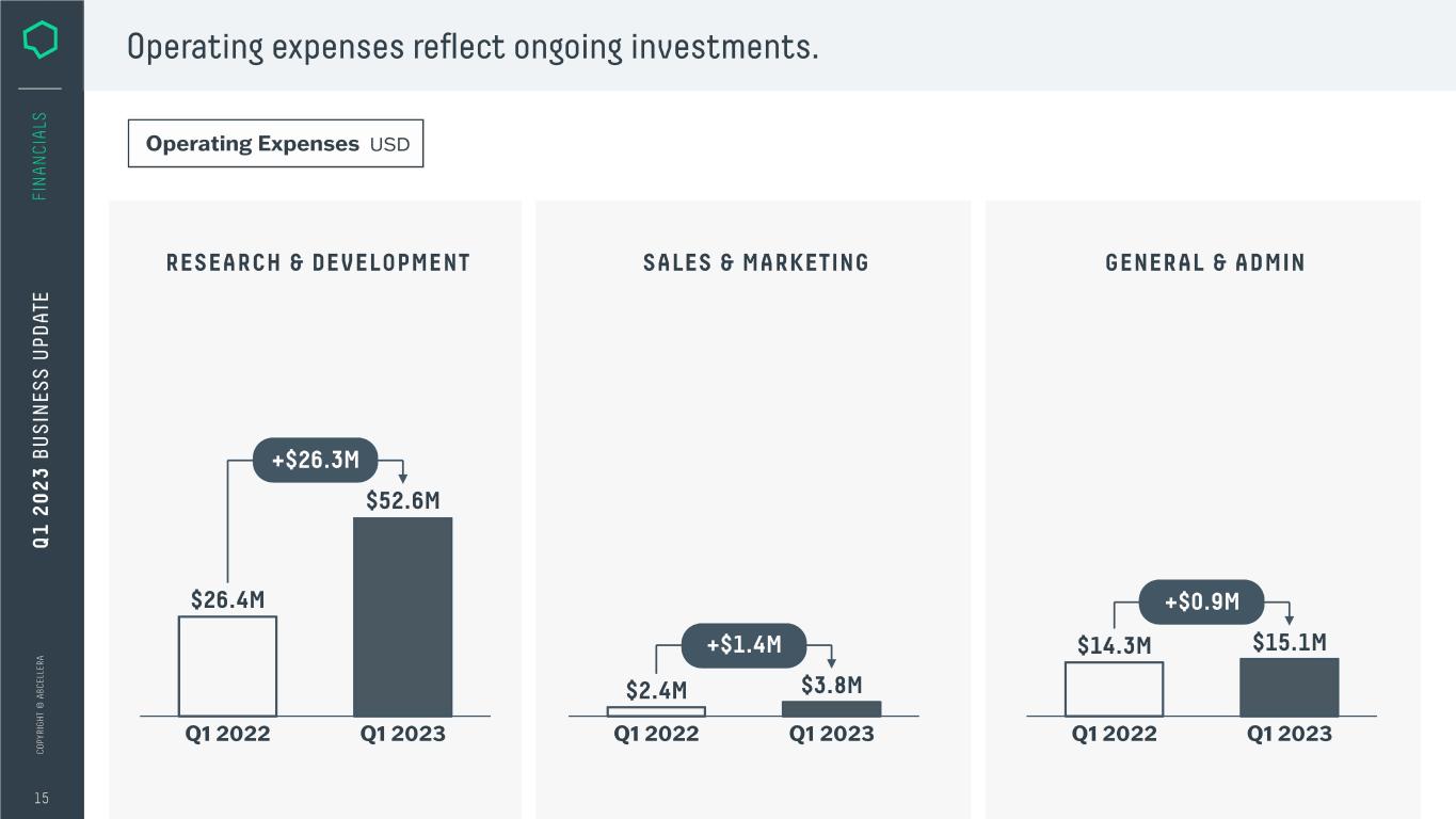 Operating expenses reflect ongoing investments. Operating Expenses USD I RESEARCH & DEVELOPMENT SALES & MARKETING GENERAL & ADMIN $52.6M $26.4M $14.3M $15.lM $2.4M $3.SM Q12022 Q12023 Q12022 Q12023 Q12022 Q12023