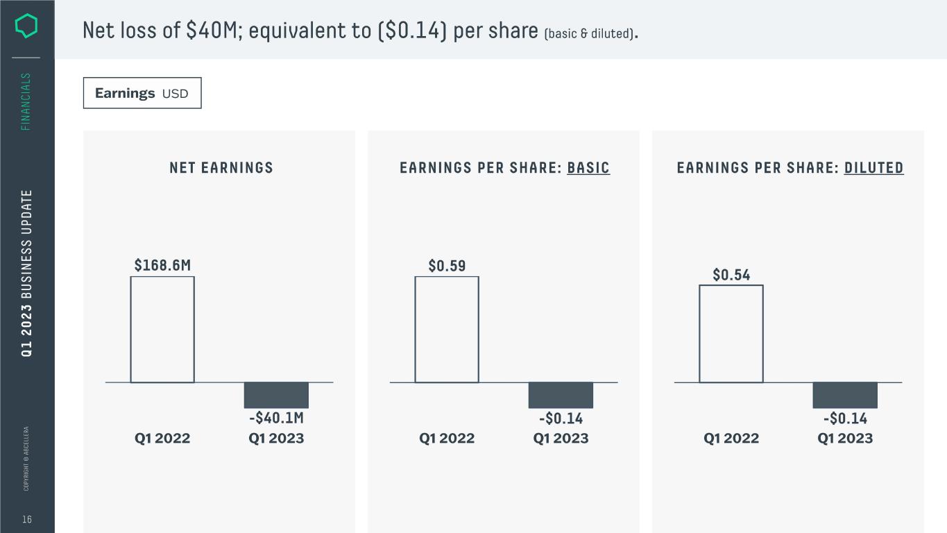 Net loss of $40M; equivalent to ($0.14) per share (basic&diluted). Earnings USD NET EARNINGS $168.6M Q12022 -$40.lM Q12023 EARNINGS PER SHARE: BASIC $0.59 Q12022 -$0.14 Q12023 EARNINGS PER SHARE: DILUTED $0.54 Q12022 -$0.14 Q12023