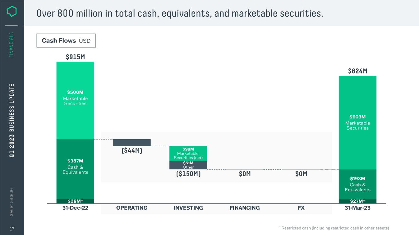 Over 800 million in total cash, equivalents, and marketable securities. Cash Flows USD S915M $500M Marketable Securities $387M Cash& Equivalents $28M* 31-Dec-22 (S44M) OPERATING $98M Marketable Securities (net) $51M Other (S15OM) INVESTING ------------------------- SOM SOM FINANCING FX S824M $603M Marketable Securities $193M Cash & Equivalents $27M* 31-Mar-23 * Restricted cash (including restricted cash in other assets)