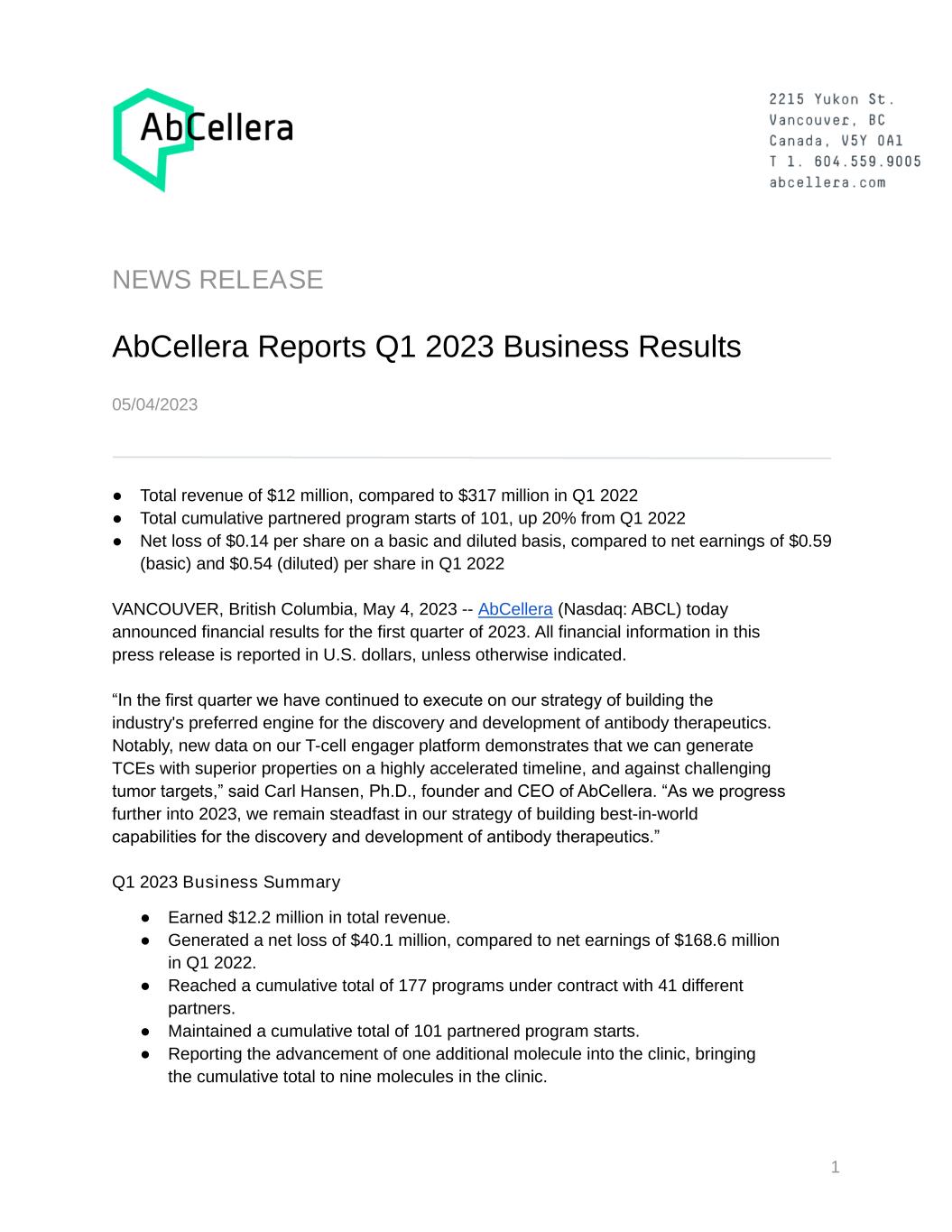 NEWS RELEASE 1 AbCellera Reports Q1 2023 Business Results 05/04/2023 ● Total revenue of $12 million, compared to $317 million in Q1 2022 ● Total cumulative partnered program starts of 101, up 20% from Q1 2022 ● Net loss of $0.14 per share on a basic and diluted basis, compared to net earnings of $0.59 (basic) and $0.54 (diluted) per share in Q1 2022 VANCOUVER, British Columbia, May 4, 2023 -- AbCellera (Nasdaq: ABCL) today announced financial results for the first quarter of 2023. All financial information in this press release is reported in U.S. dollars, unless otherwise indicated. “In the first quarter we have continued to execute on our strategy of building the industry's preferred engine for the discovery and development of antibody therapeutics. Notably, new data on our T-cell engager platform demonstrates that we can generate TCEs with superior properties on a highly accelerated timeline, and against challenging tumor targets,” said Carl Hansen, Ph.D., founder and CEO of AbCellera. “As we progress further into 2023, we remain steadfast in our strategy of building best-in-world capabilities for the discovery and development of antibody therapeutics.” Q1 2023 Business Summary ● Earned $12.2 million in total revenue. ● Generated a net loss of $40.1 million, compared to net earnings of $168.6 million in Q1 2022. ● Reached a cumulative total of 177 programs under contract with 41 different partners. ● Maintained a cumulative total of 101 partnered program starts. ● Reporting the advancement of one additional molecule into the clinic, bringing the cumulative total to nine molecules in the clinic. ellera 2215 Yukon St. Vancouver, BC Canada, V5Y 0Al T 1. 604.559.9005 abcelle.ra.com