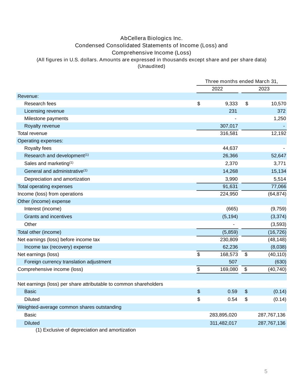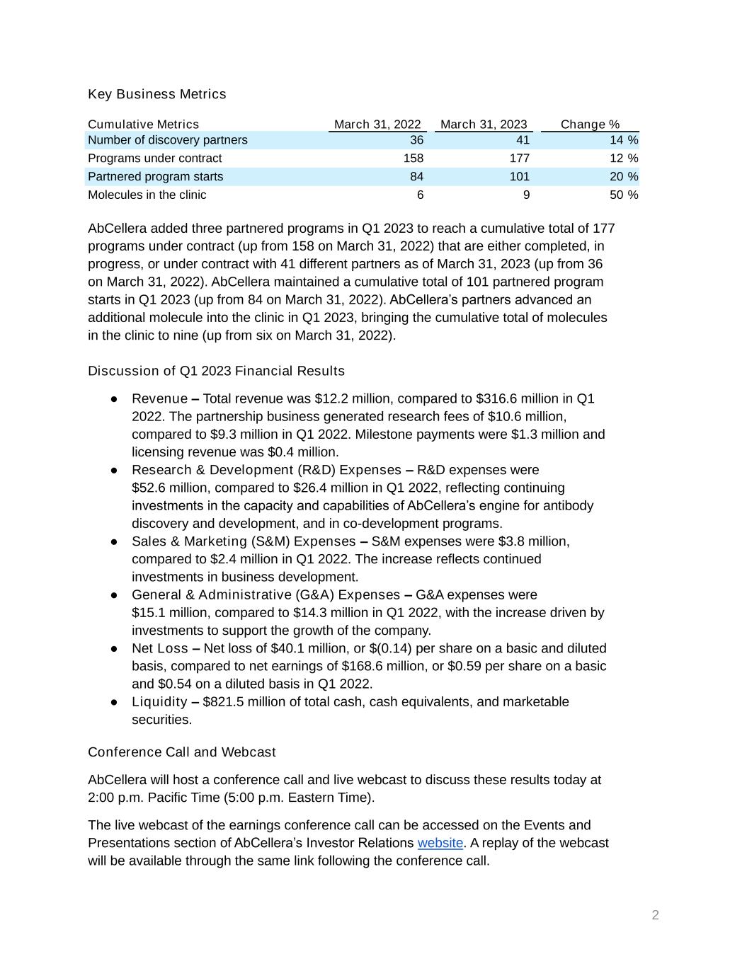 2 Key Business Metrics Cumulative Metrics March 31, 2022 March 31, 2023 Change % Number of discovery partners 36 41 14 % Programs under contract 158 177 12 % Partnered program starts 84 101 20 % Molecules in the clinic 6 9 50 % AbCellera added three partnered programs in Q1 2023 to reach a cumulative total of 177 programs under contract (up from 158 on March 31, 2022) that are either completed, in progress, or under contract with 41 different partners as of March 31, 2023 (up from 36 on March 31, 2022). AbCellera maintained a cumulative total of 101 partnered program starts in Q1 2023 (up from 84 on March 31, 2022). AbCellera’s partners advanced an additional molecule into the clinic in Q1 2023, bringing the cumulative total of molecules in the clinic to nine (up from six on March 31, 2022). Discussion of Q1 2023 Financial Results ● Revenue – Total revenue was $12.2 million, compared to $316.6 million in Q1 2022. The partnership business generated research fees of $10.6 million, compared to $9.3 million in Q1 2022. Milestone payments were $1.3 million and licensing revenue was $0.4 million. ● Research & Development (R&D) Expenses – R&D expenses were $52.6 million, compared to $26.4 million in Q1 2022, reflecting continuing investments in the capacity and capabilities of AbCellera’s engine for antibody discovery and development, and in co-development programs. ● Sales & Marketing (S&M) Expenses – S&M expenses were $3.8 million, compared to $2.4 million in Q1 2022. The increase reflects continued investments in business development. ● General & Administrative (G&A) Expenses – G&A expenses were $15.1 million, compared to $14.3 million in Q1 2022, with the increase driven by investments to support the growth of the company. ● Net Loss – Net loss of $40.1 million, or $(0.14) per share on a basic and diluted basis, compared to net earnings of $168.6 million, or $0.59 per share on a basic and $0.54 on a diluted basis in Q1 2022. ● Liquidity – $821.5 million of total cash, cash equivalents, and marketable securities. Conference Call and Webcast AbCellera will host a conference call and live webcast to discuss these results today at 2:00 p.m. Pacific Time (5:00 p.m. Eastern Time). The live webcast of the earnings conference call can be accessed on the Events and Presentations section of AbCellera’s Investor Relations website. A replay of the webcast will be available through the same link following the conference call.