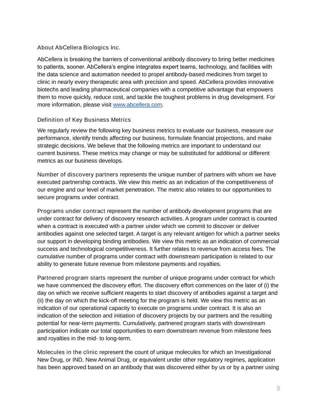 3 About AbCellera Biologics Inc. AbCellera is breaking the barriers of conventional antibody discovery to bring better medicines to patients, sooner. AbCellera’s engine integrates expert teams, technology, and facilities with the data science and automation needed to propel antibody-based medicines from target to clinic in nearly every therapeutic area with precision and speed. AbCellera provides innovative biotechs and leading pharmaceutical companies with a competitive advantage that empowers them to move quickly, reduce cost, and tackle the toughest problems in drug development. For more information, please visit www.abcellera.com. Definition of Key Business Metrics We regularly review the following key business metrics to evaluate our business, measure our performance, identify trends affecting our business, formulate financial projections, and make strategic decisions. We believe that the following metrics are important to understand our current business. These metrics may change or may be substituted for additional or different metrics as our business develops. Number of discovery partners represents the unique number of partners with whom we have executed partnership contracts. We view this metric as an indication of the competitiveness of our engine and our level of market penetration. The metric also relates to our opportunities to secure programs under contract. Programs under contract represent the number of antibody development programs that are under contract for delivery of discovery research activities. A program under contract is counted when a contract is executed with a partner under which we commit to discover or deliver antibodies against one selected target. A target is any relevant antigen for which a partner seeks our support in developing binding antibodies. We view this metric as an indication of commercial success and technological competitiveness. It further relates to revenue from access fees. The cumulative number of programs under contract with downstream participation is related to our ability to generate future revenue from milestone payments and royalties. Partnered program starts represent the number of unique programs under contract for which we have commenced the discovery effort. The discovery effort commences on the later of (i) the day on which we receive sufficient reagents to start discovery of antibodies against a target and (ii) the day on which the kick-off meeting for the program is held. We view this metric as an indication of our operational capacity to execute on programs under contract. It is also an indication of the selection and initiation of discovery projects by our partners and the resulting potential for near-term payments. Cumulatively, partnered program starts with downstream participation indicate our total opportunities to earn downstream revenue from milestone fees and royalties in the mid- to long-term. Molecules in the clinic represent the count of unique molecules for which an Investigational New Drug, or IND, New Animal Drug, or equivalent under other regulatory regimes, application has been approved based on an antibody that was discovered either by us or by a partner using