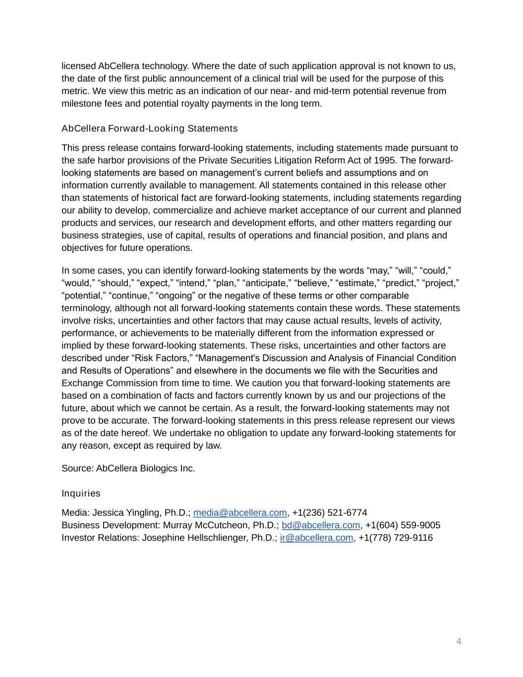 4 licensed AbCellera technology. Where the date of such application approval is not known to us, the date of the first public announcement of a clinical trial will be used for the purpose of this metric. We view this metric as an indication of our near- and mid-term potential revenue from milestone fees and potential royalty payments in the long term. AbCellera Forward-Looking Statements This press release contains forward-looking statements, including statements made pursuant to the safe harbor provisions of the Private Securities Litigation Reform Act of 1995. The forward- looking statements are based on management’s current beliefs and assumptions and on information currently available to management. All statements contained in this release other than statements of historical fact are forward-looking statements, including statements regarding our ability to develop, commercialize and achieve market acceptance of our current and planned products and services, our research and development efforts, and other matters regarding our business strategies, use of capital, results of operations and financial position, and plans and objectives for future operations. In some cases, you can identify forward-looking statements by the words “may,” “will,” “could,” “would,” “should,” “expect,” “intend,” “plan,” “anticipate,” “believe,” “estimate,” “predict,” “project,” “potential,” “continue,” “ongoing” or the negative of these terms or other comparable terminology, although not all forward-looking statements contain these words. These statements involve risks, uncertainties and other factors that may cause actual results, levels of activity, performance, or achievements to be materially different from the information expressed or implied by these forward-looking statements. These risks, uncertainties and other factors are described under “Risk Factors,” “Management's Discussion and Analysis of Financial Condition and Results of Operations” and elsewhere in the documents we file with the Securities and Exchange Commission from time to time. We caution you that forward-looking statements are based on a combination of facts and factors currently known by us and our projections of the future, about which we cannot be certain. As a result, the forward-looking statements may not prove to be accurate. The forward-looking statements in this press release represent our views as of the date hereof. We undertake no obligation to update any forward-looking statements for any reason, except as required by law. Source: AbCellera Biologics Inc. Inquiries Media: Jessica Yingling, Ph.D.; media@abcellera.com, +1(236) 521-6774 Business Development: Murray McCutcheon, Ph.D.; bd@abcellera.com, +1(604) 559-9005 Investor Relations: Josephine Hellschlienger, Ph.D.; ir@abcellera.com, +1(778) 729-9116