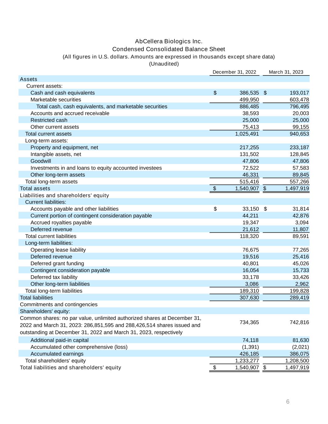 6 AbCellera Biologics Inc. Condensed Consolidated Balance Sheet (All figures in U.S. dollars. Amounts are expressed in thousands except share data) (Unaudited) December 31, 2022 March 31, 2023 Assets Current assets: Cash and cash equivalents $ 386,535 $ 193,017 Marketable securities 499,950 603,478 Total cash, cash equivalents, and marketable securities 886,485 796,495 Accounts and accrued receivable 38,593 20,003 Restricted cash 25,000 25,000 Other current assets 75,413 99,155 Total current assets 1,025,491 940,653 Long-term assets: Property and equipment, net 217,255 233,187 Intangible assets, net 131,502 128,845 Goodwill 47,806 47,806 Investments in and loans to equity accounted investees 72,522 57,583 Other long-term assets 46,331 89,845 Total long-term assets 515,416 557,266 Total assets $ 1,540,907 $ 1,497,919 Liabilities and shareholders' equity Current liabilities: Accounts payable and other liabilities $ 33,150 $ 31,814 Current portion of contingent consideration payable 44,211 42,876 Accrued royalties payable 19,347 3,094 Deferred revenue 21,612 11,807 Total current liabilities 118,320 89,591 Long-term liabilities: Operating lease liability 76,675 77,265 Deferred revenue 19,516 25,416 Deferred grant funding 40,801 45,026 Contingent consideration payable 16,054 15,733 Deferred tax liability 33,178 33,426 Other long-term liabilities 3,086 2,962 Total long-term liabilities 189,310 199,828 Total liabilities 307,630 289,419 Commitments and contingencies Shareholders' equity: Common shares: no par value, unlimited authorized shares at December 31, 2022 and March 31, 2023: 286,851,595 and 288,426,514 shares issued and outstanding at December 31, 2022 and March 31, 2023, respectively 734,365 742,816 Additional paid-in capital 74,118 81,630 Accumulated other comprehensive (loss) (1,391) (2,021) Accumulated earnings 426,185 386,075 Total shareholders' equity 1,233,277 1,208,500 Total liabilities and shareholders' equity $ 1,540,907 $ 1,497,919