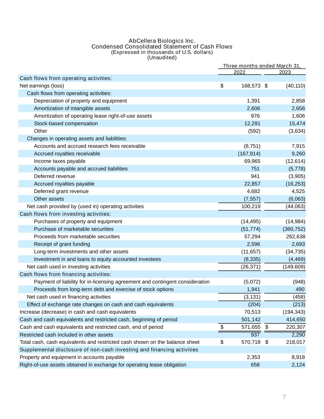 7 AbCellera Biologics Inc. Condensed Consolidated Statement of Cash Flows (Expressed in thousands of U.S. dollars) (Unaudited) Three months ended March 31, 2022 2023 Cash flows from operating activities: Net earnings (loss) $ 168,573 $ (40,110) Cash flows from operating activities: Depreciation of property and equipment 1,391 2,858 Amortization of intangible assets 2,606 2,656 Amortization of operating lease right-of-use assets 976 1,606 Stock-based compensation 12,291 15,474 Other (592) (3,634) Changes in operating assets and liabilities: Accounts and accrued research fees receivable (8,751) 7,915 Accrued royalties receivable (167,914) 9,260 Income taxes payable 69,965 (12,614) Accounts payable and accrued liabilities 751 (5,778) Deferred revenue 941 (3,905) Accrued royalties payable 22,857 (16,253) Deferred grant revenue 4,682 4,525 Other assets (7,557) (6,063) Net cash provided by (used in) operating activities 100,219 (44,063) Cash flows from investing activities: Purchases of property and equipment (14,495) (14,984) Purchase of marketable securities (51,774) (360,752) Proceeds from marketable securities 57,294 262,638 Receipt of grant funding 2,596 2,693 Long-term investments and other assets (11,657) (34,735) Investment in and loans to equity accounted investees (8,335) (4,469) Net cash used in investing activities (26,371) (149,609) Cash flows from financing activities: Payment of liability for in-licensing agreement and contingent consideration (5,072) (948) Proceeds from long-term debt and exercise of stock options 1,941 490 Net cash used in financing activities (3,131) (458) Effect of exchange rate changes on cash and cash equivalents (204) (213) Increase (decrease) in cash and cash equivalents 70,513 (194,343) Cash and cash equivalents and restricted cash, beginning of period 501,142 414,650 Cash and cash equivalents and restricted cash, end of period $ 571,655 $ 220,307 Restricted cash included in other assets 937 2,290 Total cash, cash equivalents and restricted cash shown on the balance sheet $ 570,718 $ 218,017 Supplemental disclosure of non-cash investing and financing activities Property and equipment in accounts payable 2,353 8,918 Right-of-use assets obtained in exchange for operating lease obligation 658 2,124