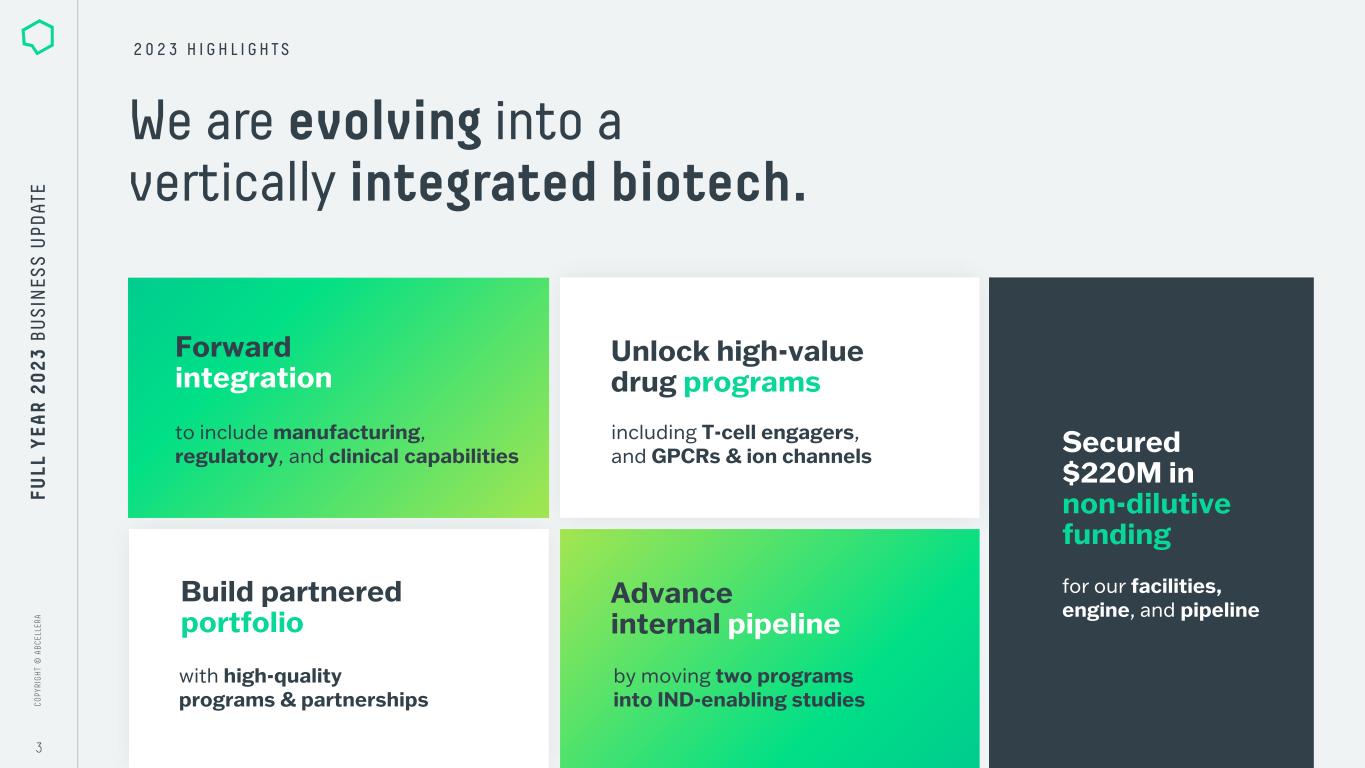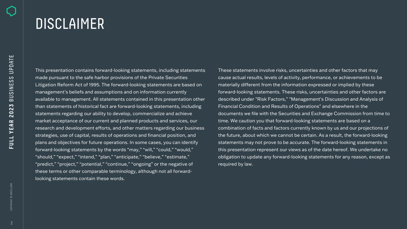 C O PY RI G H T © A B C EL LE RA DISCLAIMER 2 This presentation contains forward-looking statements, including statements made pursuant to the safe harbor provisions of the Private Securities Litigation Reform Act of 1995. The forward-looking statements are based on management’s beliefs and assumptions and on information currently available to management. All statements contained in this presentation other than statements of historical fact are forward-looking statements, including statements regarding our ability to develop, commercialize and achieve market acceptance of our current and planned products and services, our research and development efforts, and other matters regarding our business strategies, use of capital, results of operations and financial position, and plans and objectives for future operations. In some cases, you can identify forward-looking statements by the words “may,” “will,” “could,” “would,” “should,” “expect,” “intend,” “plan,” “anticipate,” “believe,” “estimate,” “predict,” “project,” “potential,” “continue,” “ongoing” or the negative of these terms or other comparable terminology, although not all forward- looking statements contain these words. These statements involve risks, uncertainties and other factors that may cause actual results, levels of activity, performance, or achievements to be materially different from the information expressed or implied by these forward-looking statements. These risks, uncertainties and other factors are described under "Risk Factors," "Management's Discussion and Analysis of Financial Condition and Results of Operations" and elsewhere in the documents we file with the Securities and Exchange Commission from time to time. We caution you that forward-looking statements are based on a combination of facts and factors currently known by us and our projections of the future, about which we cannot be certain. As a result, the forward-looking statements may not prove to be accurate. The forward-looking statements in this presentation represent our views as of the date hereof. We undertake no obligation to update any forward-looking statements for any reason, except as required by law. FU LL Y EA R 2 0 2 3 B U S IN ES S U PD AT E
