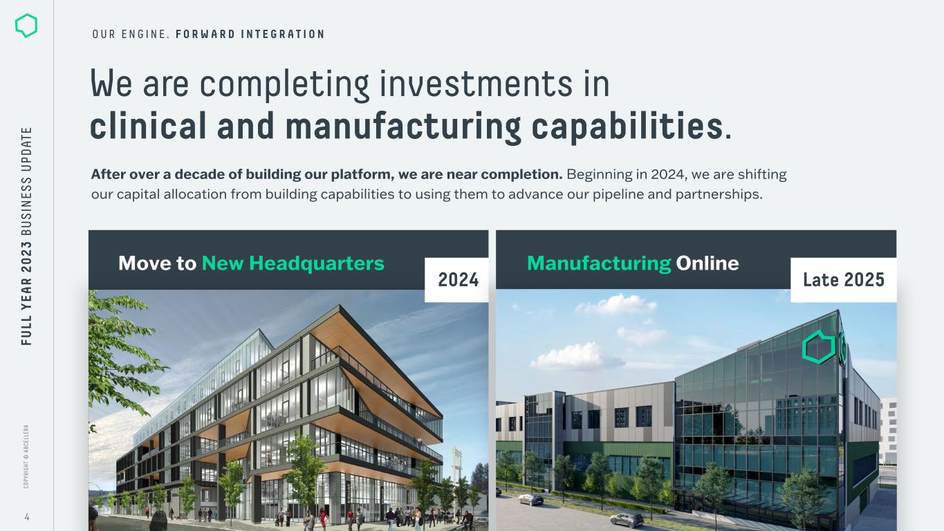 C O PY RI G H T © A B C EL LE RA C O PY RI G H T © A B C EL LE RA 3 FU LL Y EA R 2 0 2 3 B U S IN ES S U PD AT E We are evolving into a vertically integrated biotech. to include manufacturing, regulatory, and clinical capabilities including T-cell engagers, and GPCRs & ion channels by moving two programs into IND-enabling studies 2 0 2 3 H I G H L I G H T S Forward integration Unlock high-value drug programs Build partnered portfolio with high-quality programs & partnerships Advance internal pipeline Secured $220M in non-dilutive funding for our facilities, engine, and pipeline