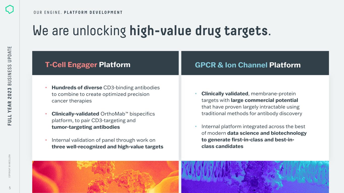C O PY RI G H T © A B C EL LE RA C O PY RI G H T © A B C EL LE RA 4 O U R E N G I N E . F O R W A R D I N T E G R A T I O N We are completing investments in clinical and manufacturing capabilities. After over a decade of building our platform, we are near completion. Beginning in 2024, we are shifting our capital allocation from building capabilities to using them to advance our pipeline and partnerships. 2024 Late 2025 Manufacturing OnlineMove to New Headquarters FU LL Y EA R 2 0 2 3 B U S IN ES S U PD AT E