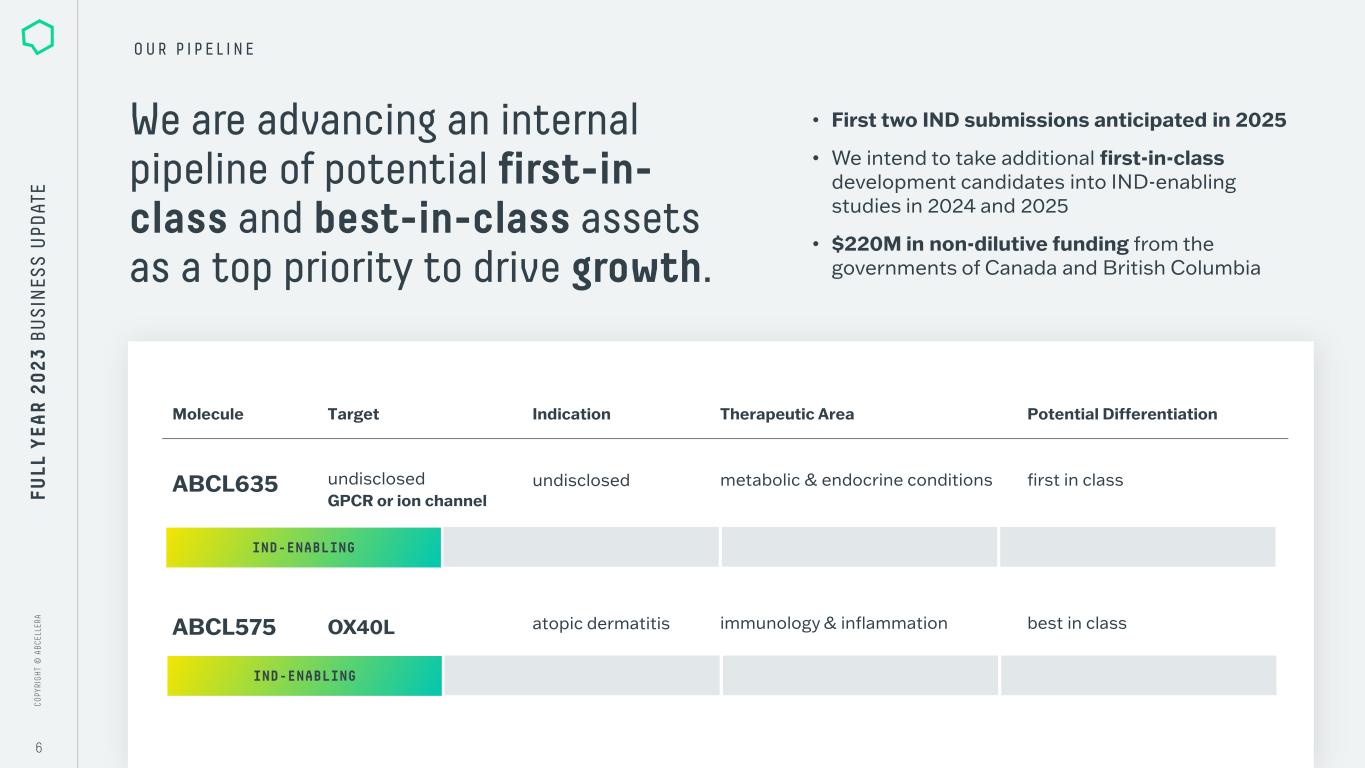 C O PY RI G H T © A B C EL LE RA C O PY RI G H T © A B C EL LE RA 5 O U R E N G I N E . P L A T F O R M D E V E L O P M E N T • Hundreds of diverse CD3-binding antibodies to combine to create optimized precision cancer therapies • Clinically-validated OrthoMab bispecifics platform, to pair CD3-targeting and tumor-targeting antibodies • Internal validation of panel through work on three well-recognized and high-value targets T-Cell Engager Platform We are unlocking high-value drug targets. GPCR & Ion Channel Platform • Clinically validated, membrane-protein targets with large commercial potential that have proven largely intractable using traditional methods for antibody discovery • Internal platform integrated across the best of modern data science and biotechnology to generate first-in-class and best-in- class candidates FU LL Y EA R 2 0 2 3 B U S IN ES S U PD AT E