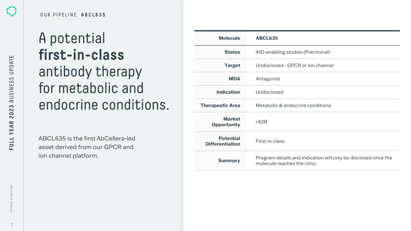 C O PY RI G H T © A B C EL LE RA C O PY RI G H T © A B C EL LE RA 6 Molecule Target Indication Therapeutic Area Potential Differentiation ABCL635 undisclosed GPCR or ion channel undisclosed metabolic & endocrine conditions first in class ABCL575 OX40L atopic dermatitis immunology & inflammation best in class We are advancing an internal pipeline of potential first-in- class and best-in-class assets as a top priority to drive growth. • First two IND submissions anticipated in 2025 • We intend to take additional first-in-class development candidates into IND-enabling studies in 2024 and 2025 • $220M in non-dilutive funding from the governments of Canada and British Columbia O U R P I P E L I N E FU LL Y EA R 2 0 2 3 B U S IN ES S U PD AT E