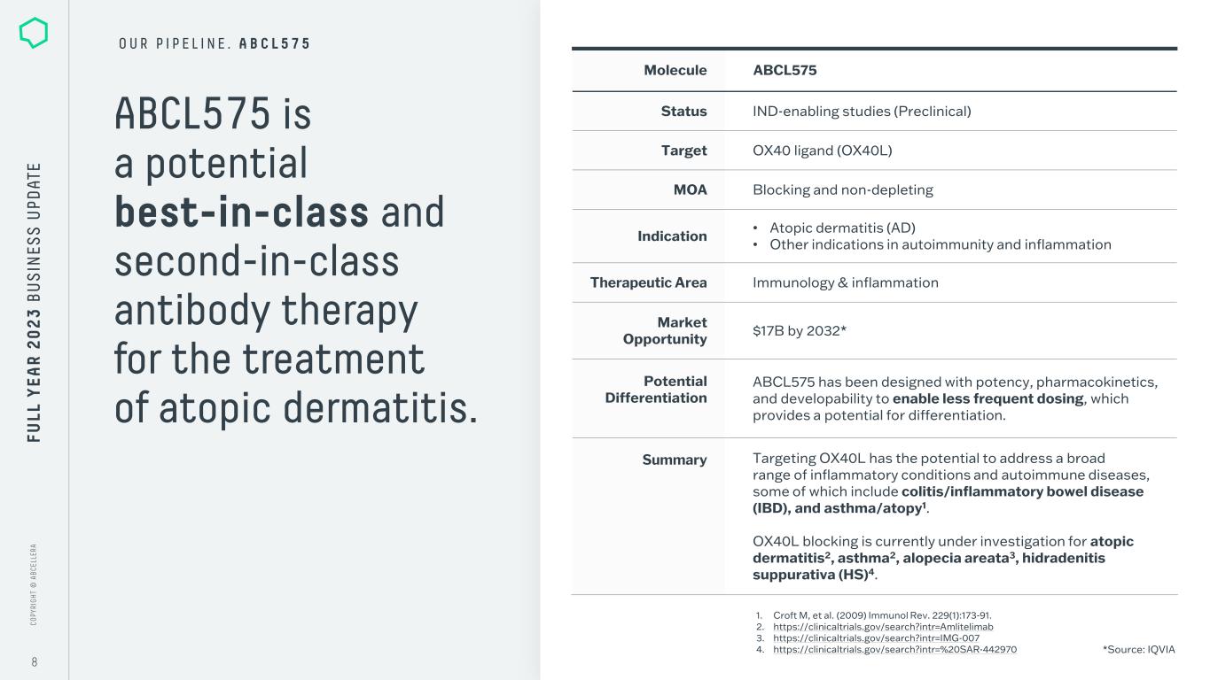 C O PY RI G H T © A B C EL LE RA C O PY RI G H T © A B C EL LE RA 7 Molecule ABCL635 Status IND-enabling studies (Preclinical) Target Undisclosed - GPCR or ion channel MOA Antagonist Indication Undisclosed Therapeutic Area Metabolic & endocrine conditions Market Opportunity >$2B Potential Differentiation First-in-class Summary Program details and indication will only be disclosed once the molecule reaches the clinic. A potential first-in-class antibody therapy for metabolic and endocrine conditions. ABCL635 is the first AbCellera-led asset derived from our GPCR and ion channel platform. FU LL Y EA R 2 0 2 3 B U S IN ES S U PD AT E O U R P I P E L I N E . A B C L 6 3 5