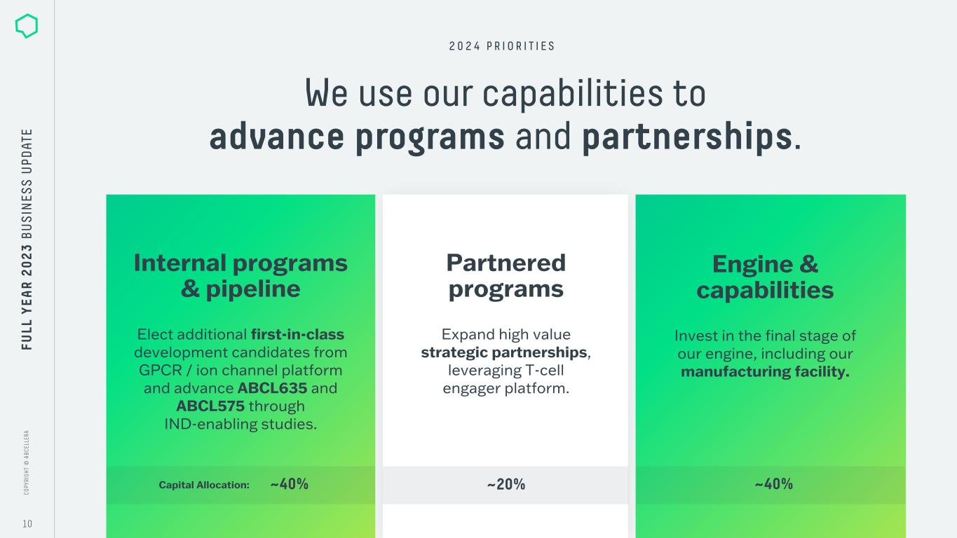 C O PY RI G H T © A B C EL LE RA C O PY RI G H T © A B C EL LE RA 9 We are increasingly focused on strategic partnerships. We look for partnerships that bring new insights into novel biology or access to unique capabilities to create opportunities in therapeutic areas of shared interest. Expanding relationships with large pharma and large biotech T-cell engager platform deals in oncology and autoimmune conditions Co-development to access new targets and technology AbbVie Company creation with top-tier venture capital groups FU LL Y EA R 2 0 2 3 B U S IN ES S U PD AT E O U R P A R T N E R S