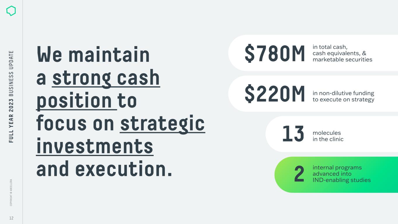 C O PY RI G H T © A B C EL LE RA C O PY RI G H T © A B C EL LE RA 12 FU LL Y EA R 2 0 2 3 B U S IN ES S U PD AT E We maintain a strong cash position to focus on strategic investments and execution. in non-dilutive funding to execute on strategy in total cash, cash equivalents, & marketable securities molecules in the clinic internal programs advanced into IND-enabling studies $780M 13 $220M 2
