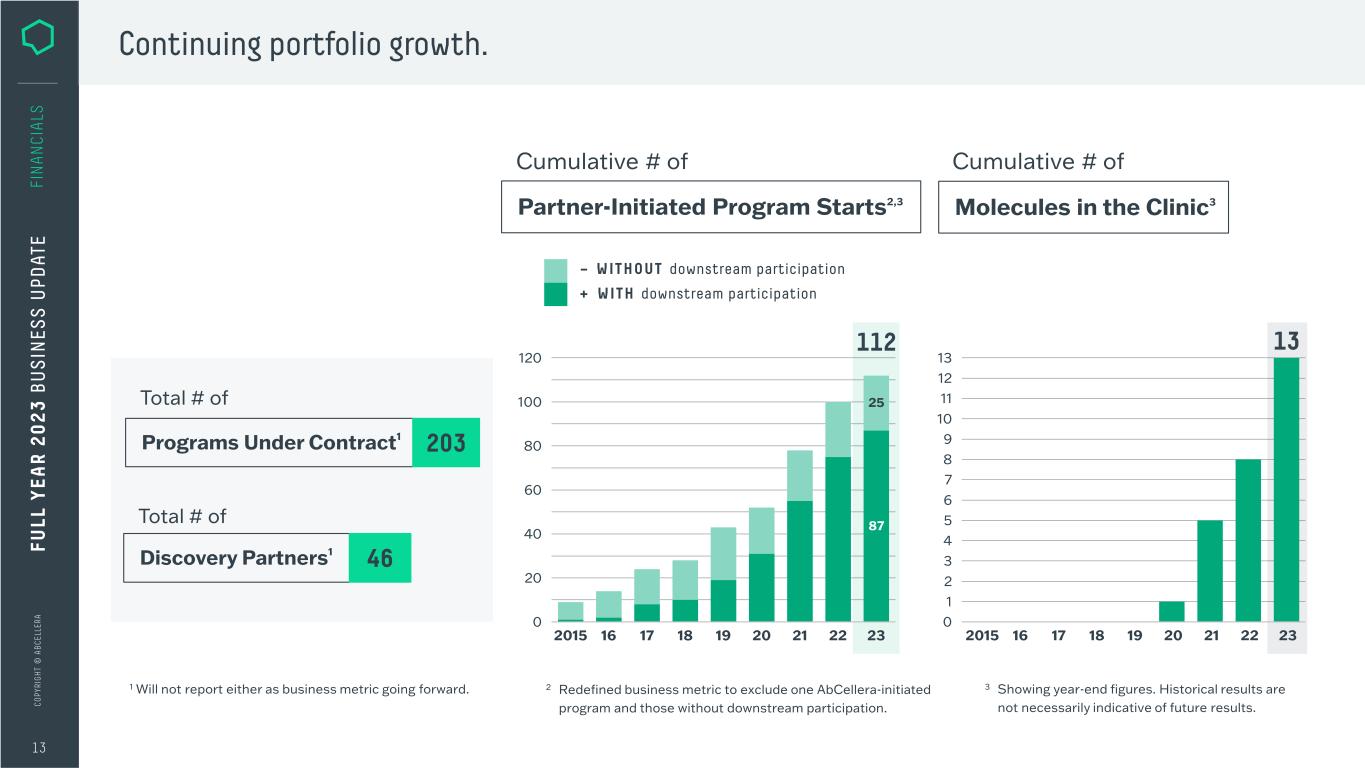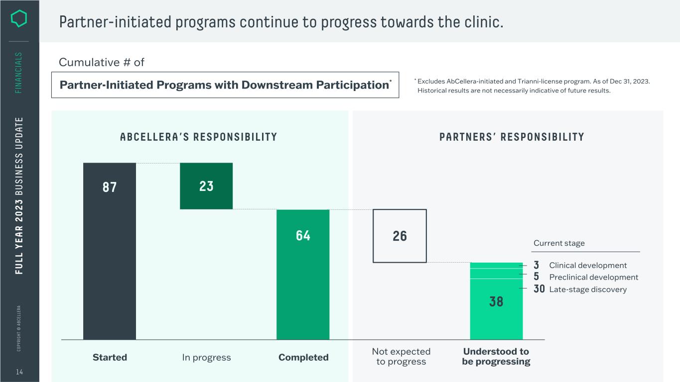 C O PY RI G H T © A B C EL LE RA 87 25 20 40 60 80 100 0 120 16 17 18 19 20 21 22 23 112 2015 Continuing portfolio growth. 13 FI N A N CI A LS 3 Showing year-end figures. Historical results are not necessarily indicative of future results. Partner-Initiated Program Starts2,3 Cumulative # of + WITH downstream participation – WITHOUT downstream participation Molecules in the Clinic3 Cumulative # of Discovery Partners1 Programs Under Contract1 203 Total # of Total # of 46 13 1 2 3 4 5 6 7 8 9 10 13 0 12 11 19 20 21 22 2318172015 16 FU LL Y EA R 2 0 2 3 B U S IN ES S U PD AT E 1 Will not report either as business metric going forward. 2 Redefined business metric to exclude one AbCellera-initiated program and those without downstream participation.