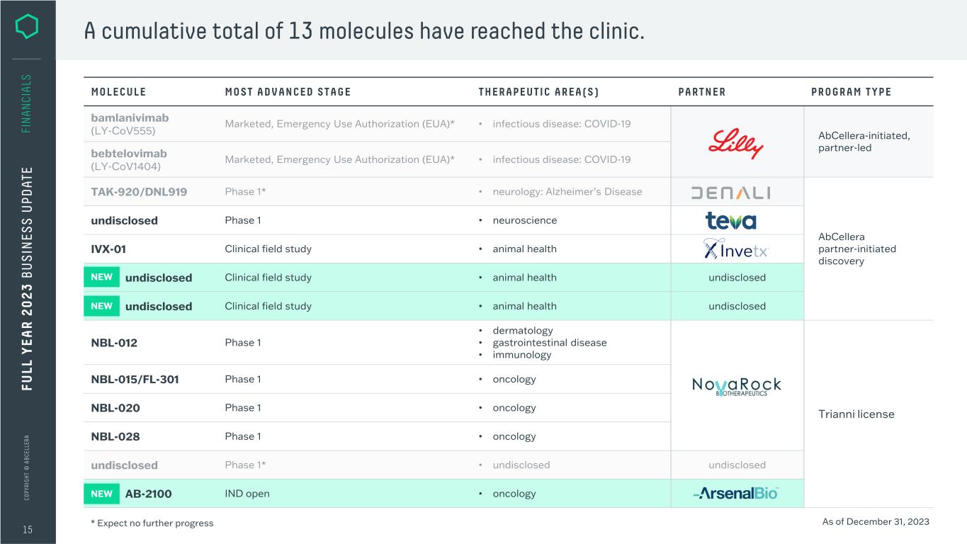C O PY RI G H T © A B C EL LE RA Partner-initiated programs continue to progress towards the clinic. 14 FI N A N CI A LS FU LL Y EA R 2 0 2 3 B U S IN ES S U PD AT E Partner-Initiated Programs with Downstream Participation* Cumulative # of 87 64 23 26 Understood to be progressingStarted Not expected to progressCompletedIn progress 38 Late-stage discovery Clinical development Preclinical development Current stage * Excludes AbCellera-initiated and Trianni-license program. As of Dec 31, 2023. Historical results are not necessarily indicative of future results. 3 5 30 ABCELLERA’S RESPONSIBILITY PARTNERS’ RESPONSIBILITY