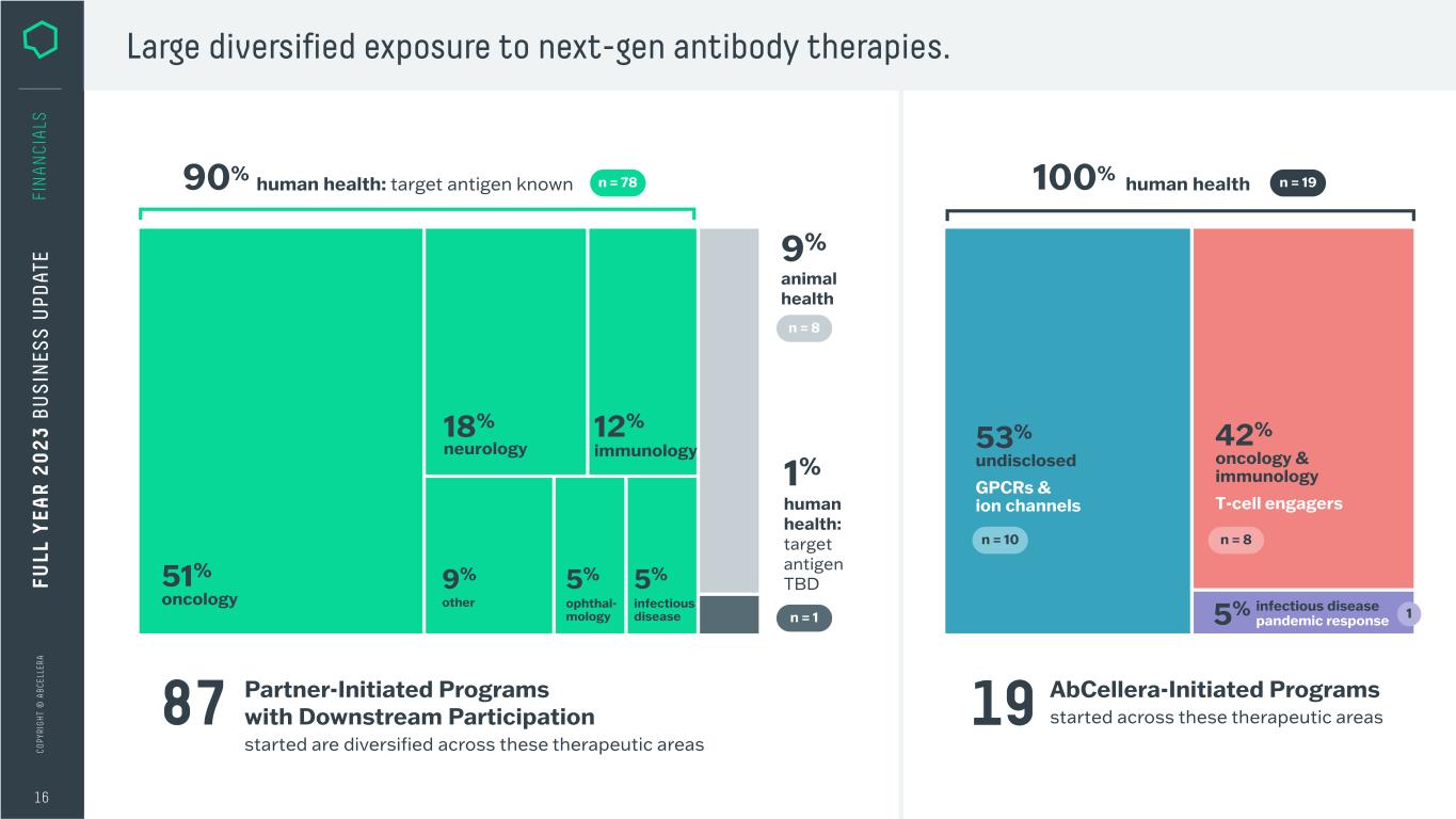C O PY RI G H T © A B C EL LE RA MOLECULE MOST ADVANCED STAGE THERAPEUTIC AREA(S) PARTNER PROGRAM TYPE AbCellera-initiated, partner-led AbCellera partner-initiated discovery undisclosed Phase 1 • neuroscience IVX-01 Clinical field study • animal health undisclosed Clinical field study • animal health undisclosed undisclosed Clinical field study • animal health undisclosed NBL-012 Phase 1 • dermatology • gastrointestinal disease • immunology Trianni license NBL-015/FL-301 Phase 1 • oncology NBL-020 Phase 1 • oncology NBL-028 Phase 1 • oncology AB-2100 IND open • oncology 15 FU LL Y EA R 2 0 2 3 B U S IN ES S U PD AT E FI N A N CI A LS A cumulative total of 13 molecules have reached the clinic. As of December 31, 2023* Expect no further progress NEW NEW NEW