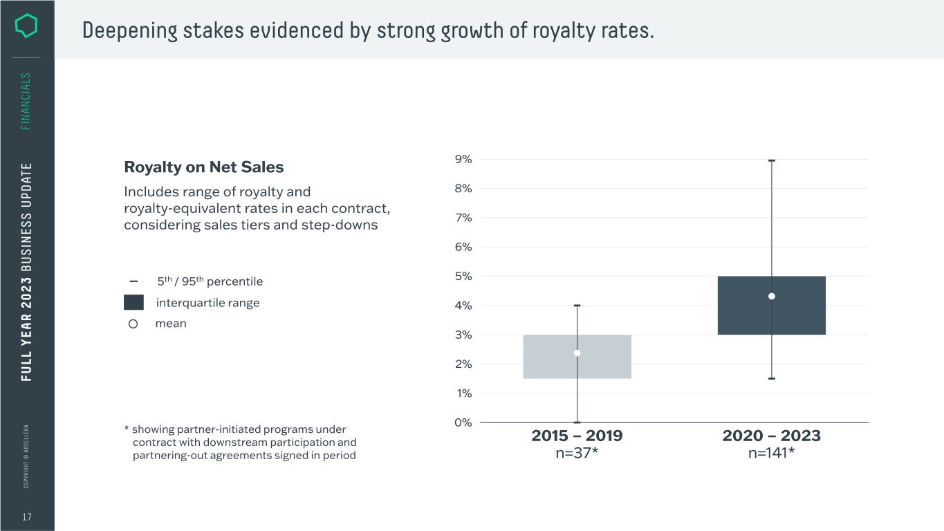 C O PY RI G H T © A B C EL LE RA Partner-Initiated Programs with Downstream Participation started are diversified across these therapeutic areas 16 Large diversified exposure to next-gen antibody therapies. ophthal- mology 5% other 9%51% oncology 18% neurology 87 AbCellera-Initiated Programs started across these therapeutic areas19 infectious disease 5% 12% immunology 42% oncology & immunology T-cell engagers 53% undisclosed GPCRs & ion channels 5% infectious disease pandemic response FU LL Y EA R 2 0 2 3 B U S IN ES S U PD AT E FI N A N CI A LS 1 100% human health n = 1990% human health: target antigen known n = 78 9% animal health n = 8 1% human health: target antigen TBD n = 1 n = 10 n = 8