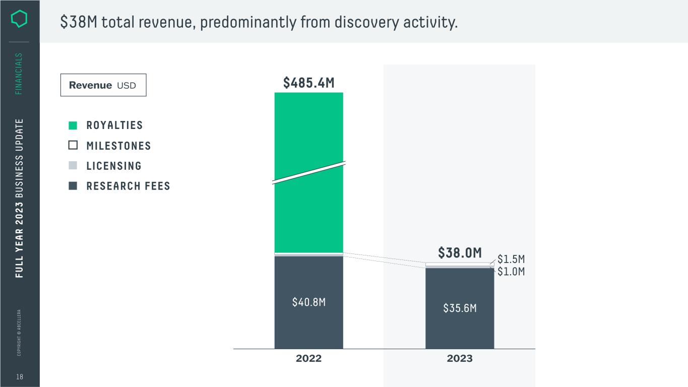 C O PY RI G H T © A B C EL LE RA 17 FI N A N CI A LS Deepening stakes evidenced by strong growth of royalty rates. * showing partner-initiated programs under contract with downstream participation and partnering-out agreements signed in period Includes range of royalty and royalty-equivalent rates in each contract, considering sales tiers and step-downs Royalty on Net Sales mean interquartile range 5th / 95th percentile FU LL Y EA R 2 0 2 3 B U S IN ES S U PD AT E 5% 0% 4% 7% 3% 8% 2% 9% 1% 6% 2020 – 2023 n=141* 2015 – 2019 n=37*