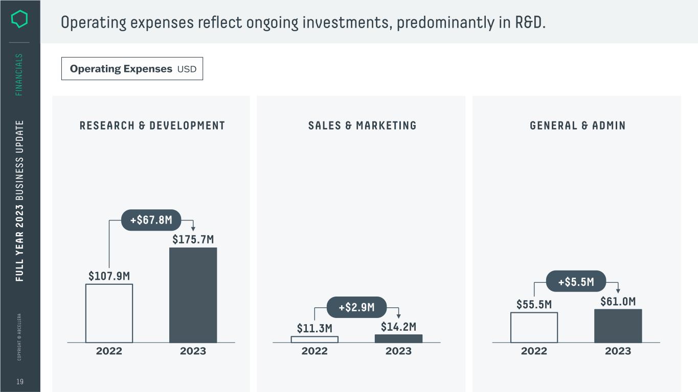 C O PY RI G H T © A B C EL LE RA 18 FI N A N CI A LS $38M total revenue, predominantly from discovery activity. MILESTONES ROYALTIES LICENSING RESEARCH FEES Revenue USD $35.6M 2022 $485.4M $38.0M 2023 $1.5M $1.0M $40.8M FU LL Y EA R 2 0 2 3 B U S IN ES S U PD AT E
