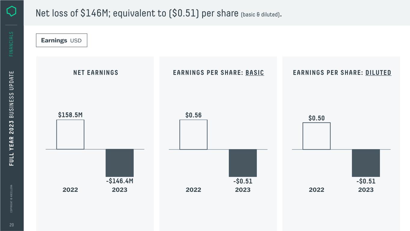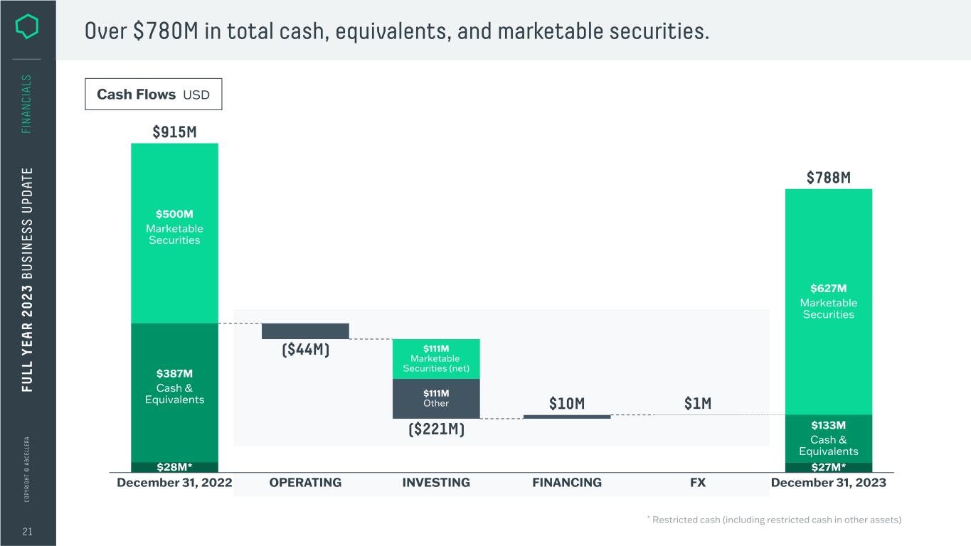 C O PY RI G H T © A B C EL LE RA 20 FI N A N CI A LS Net loss of $146M; equivalent to ($0.51) per share (basic & diluted). Earnings USD NET EARNINGS EARNINGS PER SHARE: BASIC 2022 2023 $158.5M -$146.4M $0.56 -$0.51 2022 2023 EARNINGS PER SHARE: DILUTED $0.50 -$0.51 2022 2023 FU LL Y EA R 2 0 2 3 B U S IN ES S U PD AT E