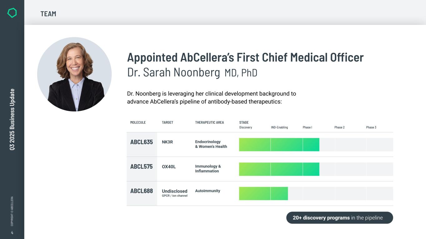 3 CO PY RI GH T © A BC EL LE RA Q3 2 02 5 Bu si ne ss U pd at e Clinical trials on track, completed platform investments, and started activities at clinical manufacturing site. ABCL635 Phase 1 clinical trials initiated (June 2025) ABCL575 Phase 1 clinical trials initiated (July 2025) Completed platform investments by the first half of the year Initiated activities at the new clinical manufacturing facility Nominated an additional development candidate for CTA-enabling studies (ABCL688) in available liquidity to execute on our strategy ~$680M 2025 PRIORITIES: Q3 2025 UPDATE