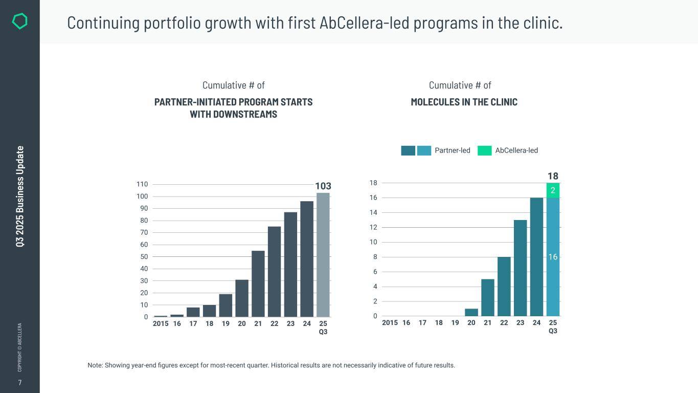 7 CO PY RI GH T © A BC EL LE RA Q3 2 02 5 Bu si ne ss U pd at e PARTNER-INITIATED PROGRAM STARTS WITH DOWNSTREAMS Cumulative # of MOLECULES IN THE CLINIC Cumulative # of Note: Showing year-end figures except for most-recent quarter. Historical results are not necessarily indicative of future results. Continuing portfolio growth with first AbCellera-led programs in the clinic. AbCellera-led Partner-led