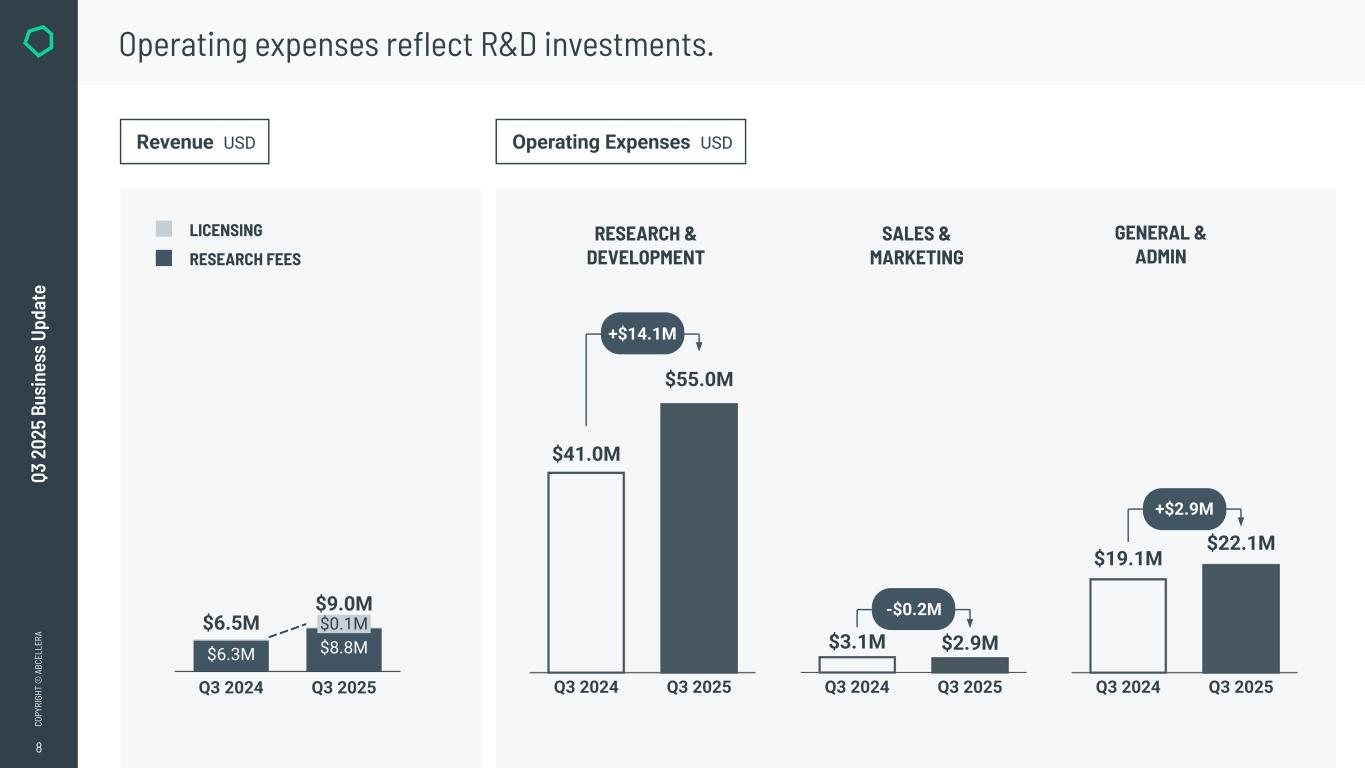 8 CO PY RI GH T © A BC EL LE RA RESEARCH & DEVELOPMENT SALES & MARKETING GENERAL & ADMIN Q3 2 02 5 Bu si ne ss U pd at e Operating expenses reflect R&D investments. Operating Expenses USDRevenue USD LICENSING RESEARCH FEES Q3 2025 $0.1M $8.8M $6.5M $9.0M Q3 2024 $6.3M Q3 2025Q3 2024 $41.0M $55.0M +$14.1M Q3 2025Q3 2024 $3.1M $2.9M -$0.2M Q3 2025Q3 2024 $19.1M $22.1M +$2.9M